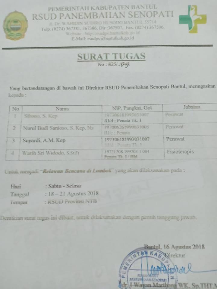 Relawan dengan komando Bapak Sihono, S.Kep dan 3 rekan perawat dan Fisioterapis akan bertugas dari tanggal 18 – 22 Agustus 2018.