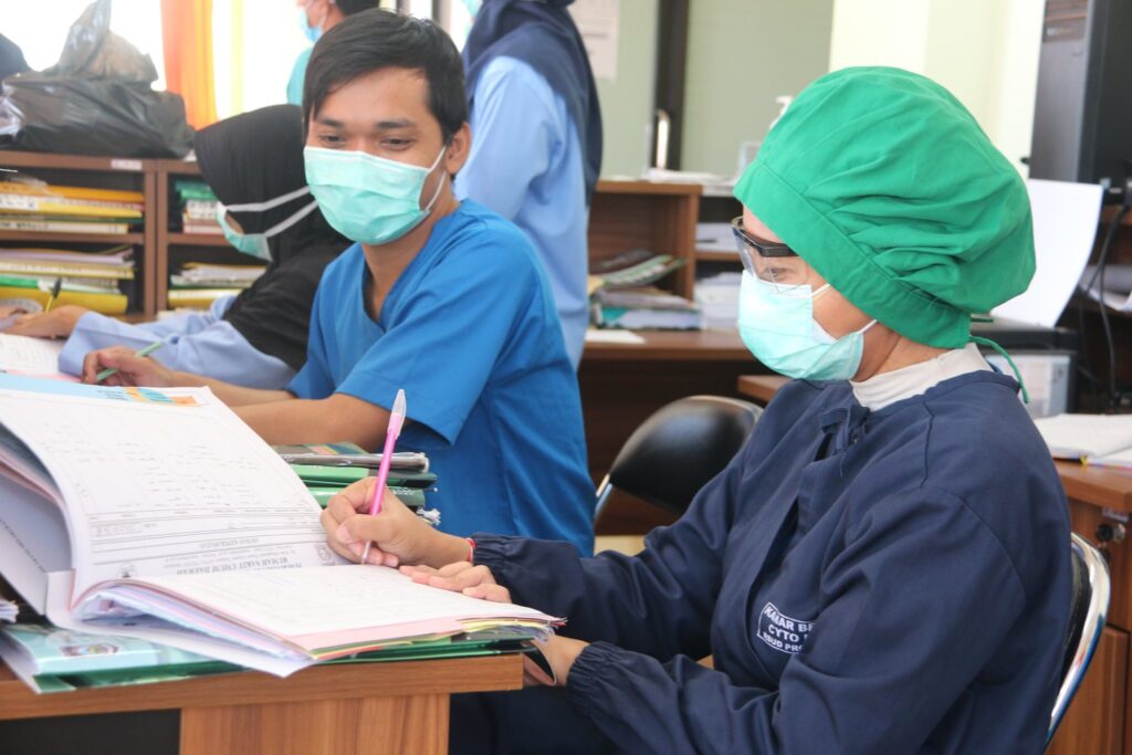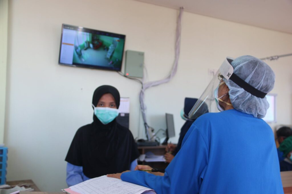 Nampak Dokter spesialis sedang melakukan visite pasien yang dirawat di Ruang Isolasi, melakukan kajian terhadap perkembangan pasien melalui laporan petugas jaga, rekam medis, pantauan CCTV dan komunikasi langsung via telpon kepada pasien. —–