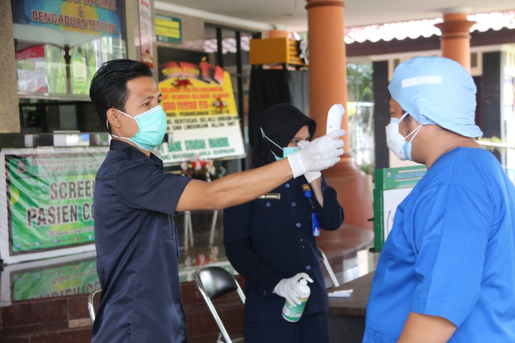 Petugas security akan membantu untuk melakukan pengecekan suhu tubuh kepada setia orang tanpa terkecuali. Langkah ini sebagai antisipasi penularan virus Covid – 19 di Lingkungan Rumah Sakit.
