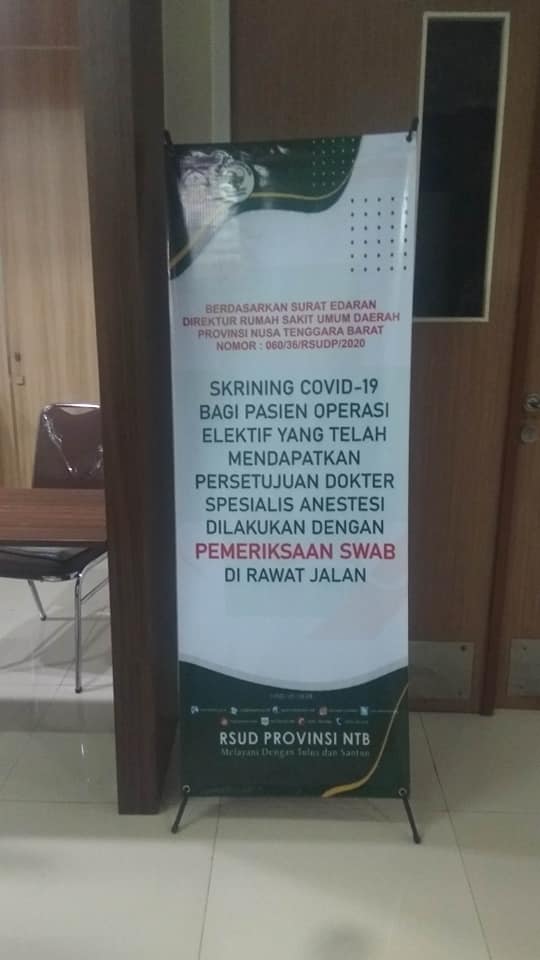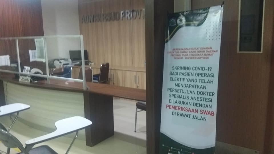Implementasi Penerapan Protokol COVID 19 yang baru diterapkan Rumah Sakit Umum Daerah Provinsi NTB melalui Surat Edaran Direktur Nomor 060/36/RSUDP/ 2020 tentang Implementasi Pelaksanaan Pedoman Pencegahan dan Pengendalian COVID 19 Revisi Kelima salah satu poinnya menyebutkan “Skrining COVID 19 Bagi Pasien Operasi Elektif yang telah mendapatkan persetujuan Spesialis Anestesi dilakukan PEMERIKSAAN SWAB di Rawat Jalan”. Pembiayaan prosedur tersebut telah masuk dalam biaya perawatan pasien. Jadi bagi pasien peserta BPJS maka sudah masuk dalam klaim BPJS.