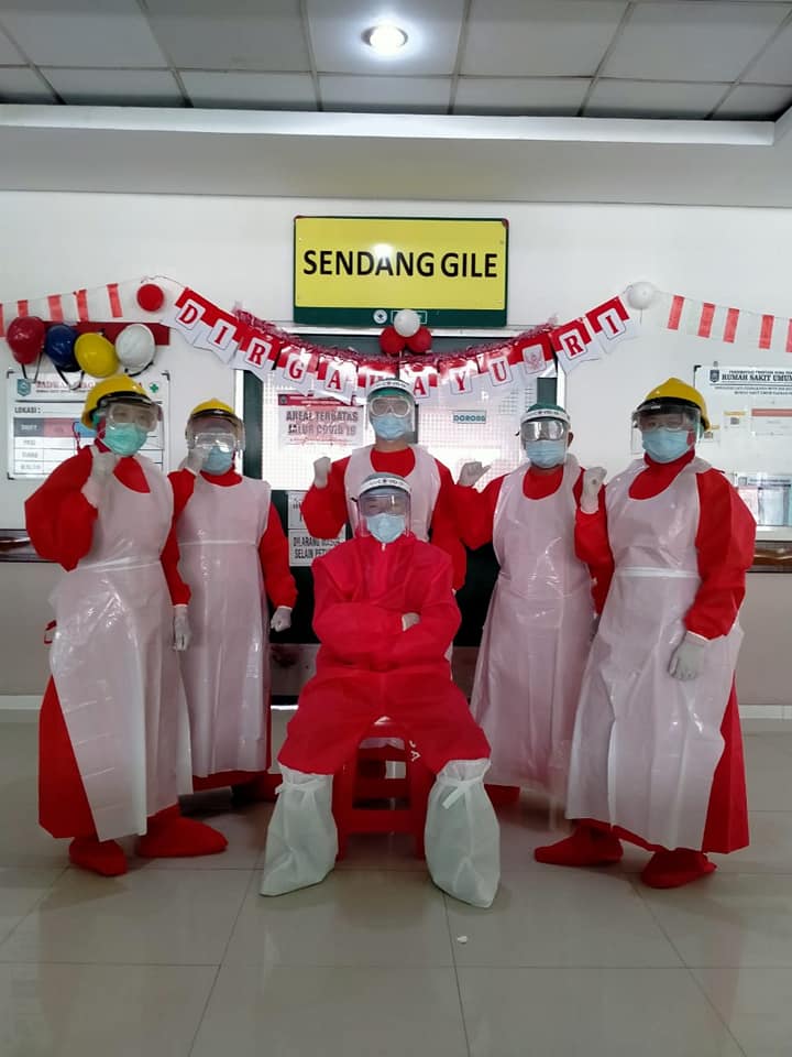 Berbagai ekspresi ditunjukkan Petugas Isolasi dengan menggunakan APD spesial HUT Kemerdekaan RI ke 75.