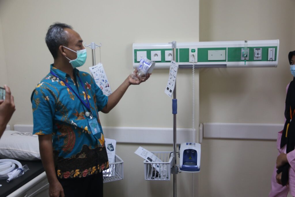 Pada kesempatan training ini, Fasilitator yang merupakan Perawat Senior ICU memperkenalkan beberapa alat khsuus yang digunakan di ruang ICU, diantaranya ventilator dan peralatan monitoring.
