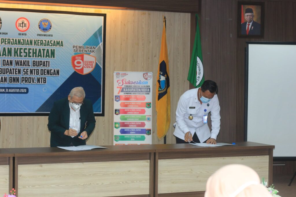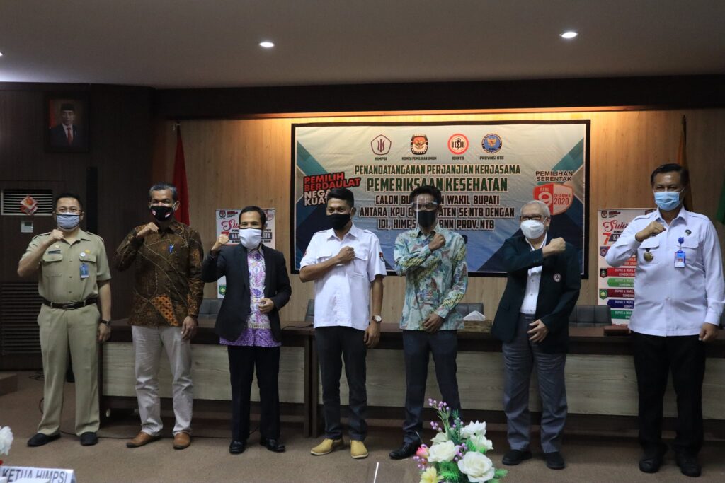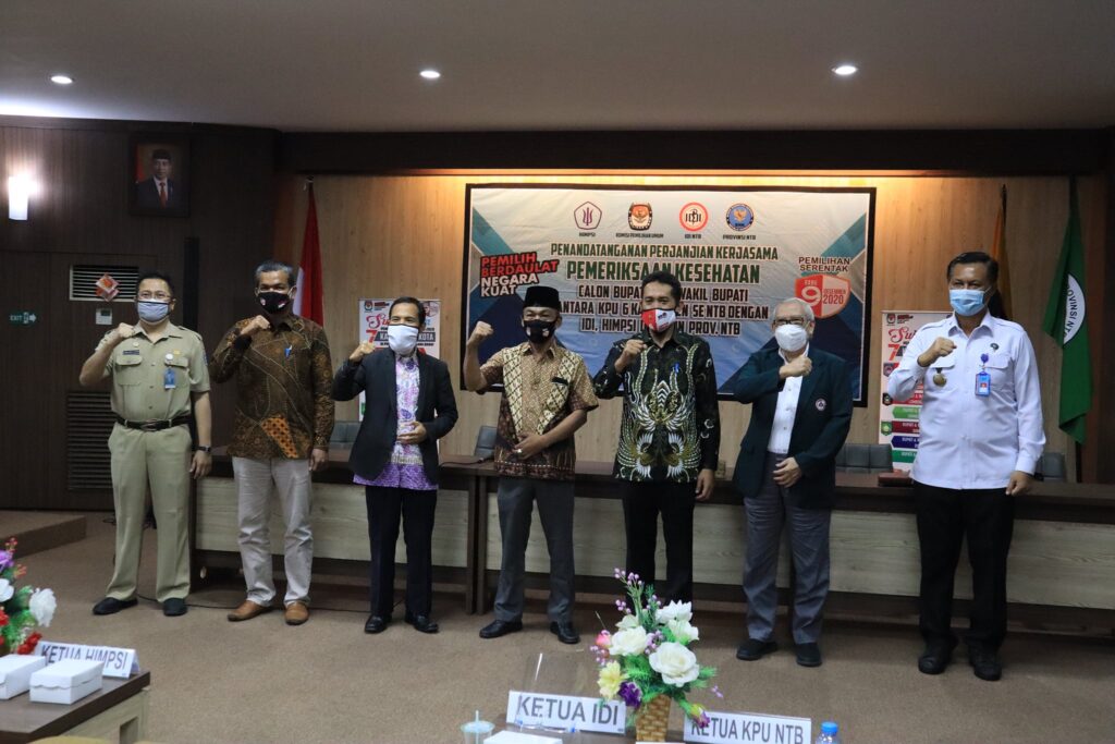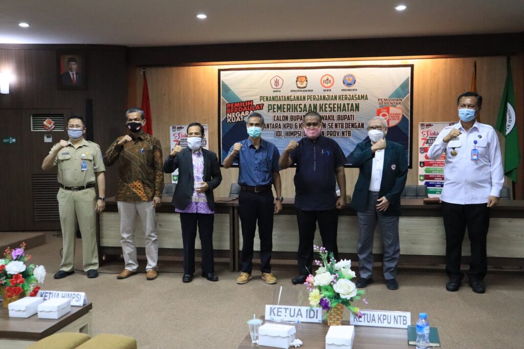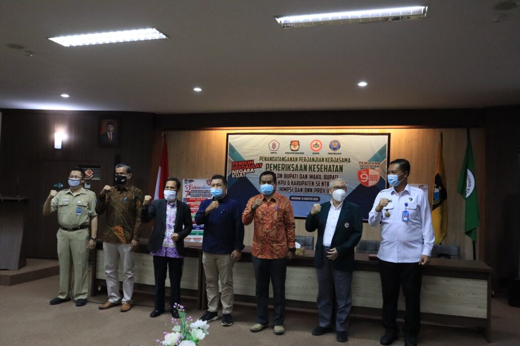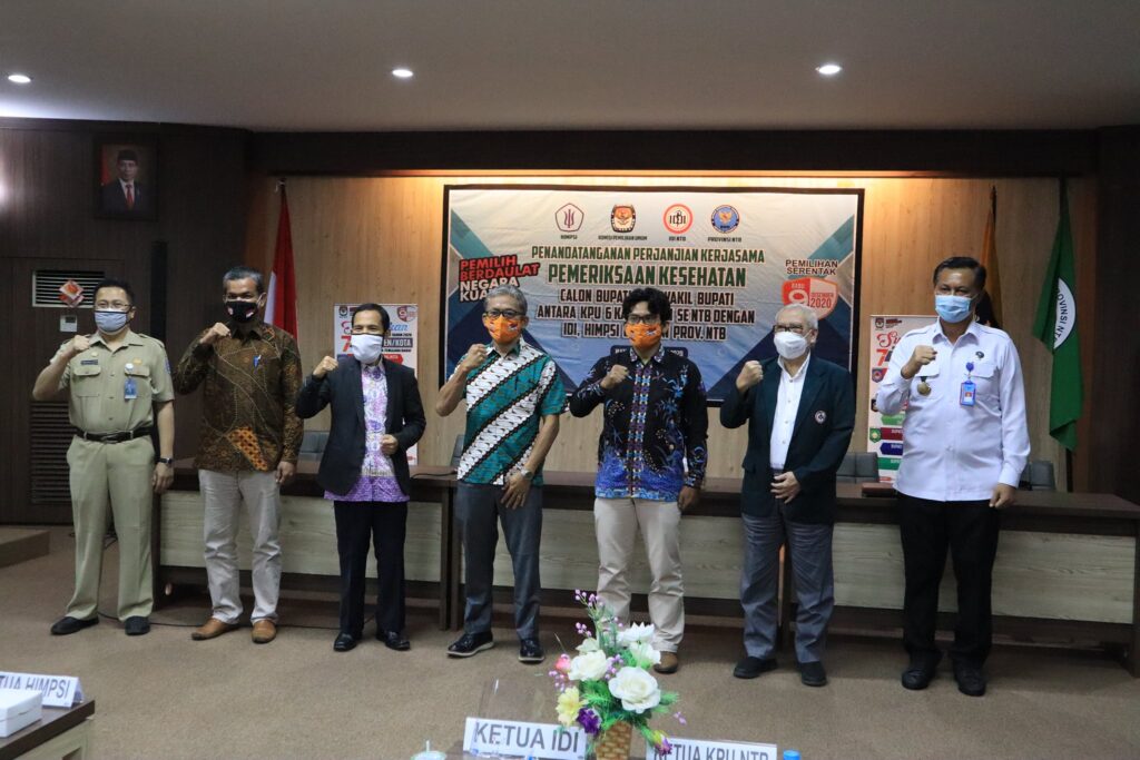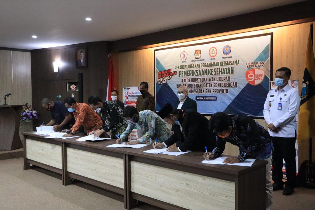 Agar pemeriksaan kesehatan berjalan secara baik, profesional, serta akuntabilitasnya dapat dipertanggungjawabkan maka hari ini dilakukan penandatangan perjanjian kerjasama pemeriksaan kesehatan Calon Bupati dan Wakil Bupati antara KPU Provinsi NTB, 6 (enam) Kabupaten se-Nusa Tenggara Barat dengan Ikatan Dokter Indonesia (IDI) Wilayah NTB, Himpunan Psikolog Indonesia (HIMPSI) NTB dan Badan Narkotika Nasional (BNN) Provinsi NTB agar dapat melahirkan kepemimpinan yang sehat secara jasmani dan rohani.