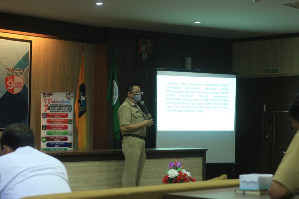 Wakil Direktur Pelayanan, dr. Agus Rusdhy Hamid, Sp.OG (K) MARS menyampaikan protocol dan prosedur pemeriksaan bapaslon Bupati dan wakil bupati Tahun 2020. Materi penilaian meliputi kemampuan rohani dan jasmani bapaslon pada pemilihan serentak tahun 2020.
