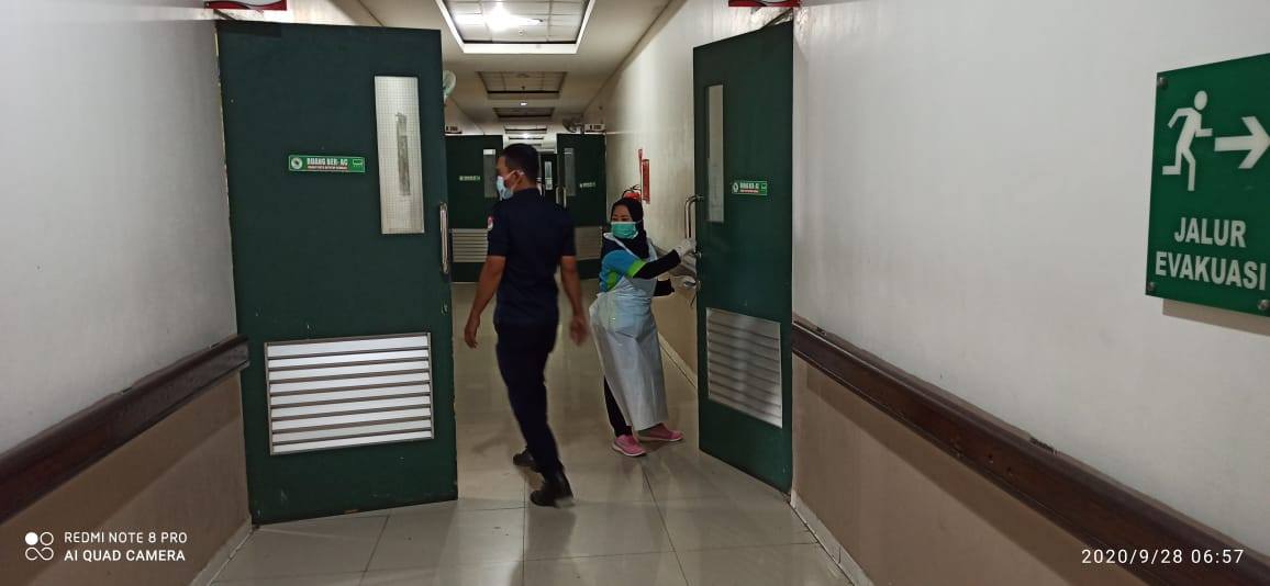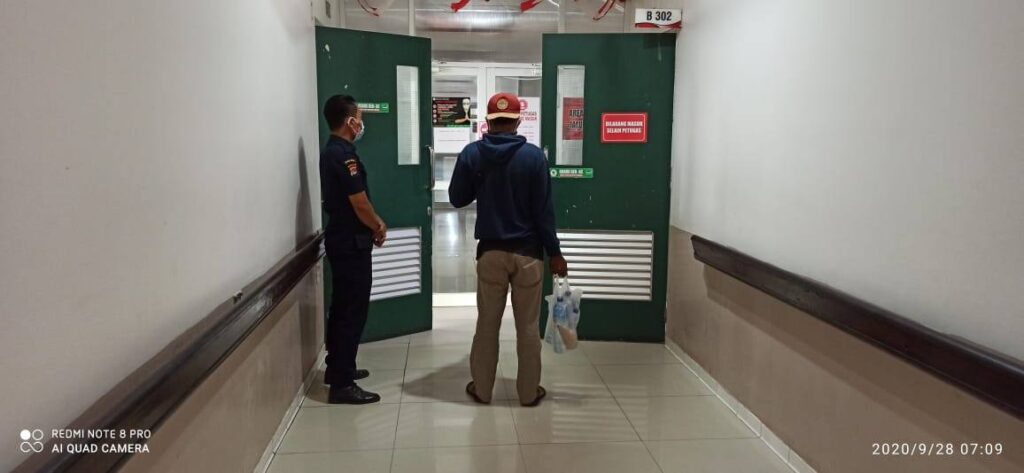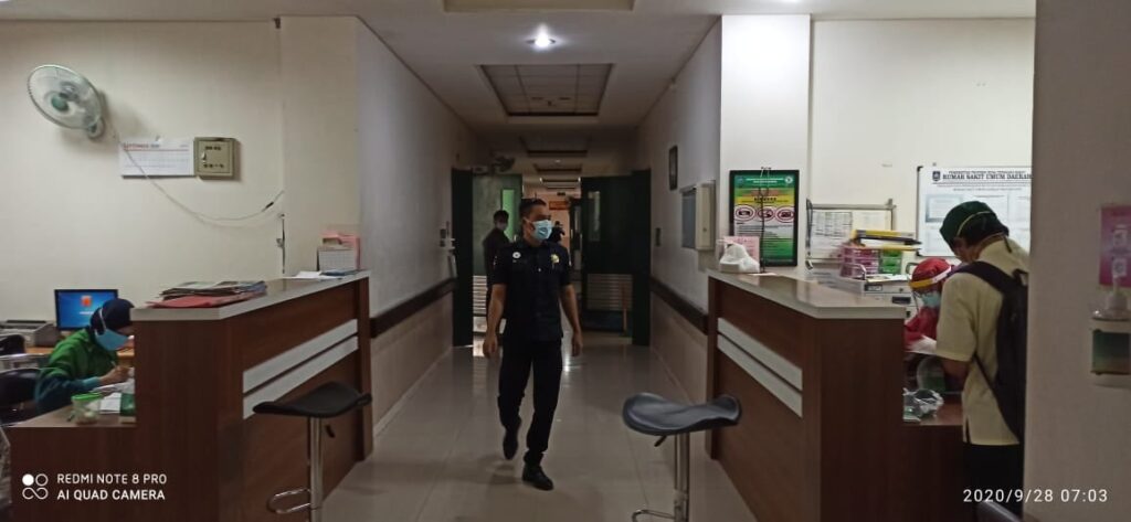 Monitoring oleh Petugas Keamanan secara rutin dilaksanakan untuk memastikan penerapan protokol kesehatan dan kapasitas jumlah penunggu pasien tidak melebih 1 orang yang ebrada di dalam ruang perawatan.