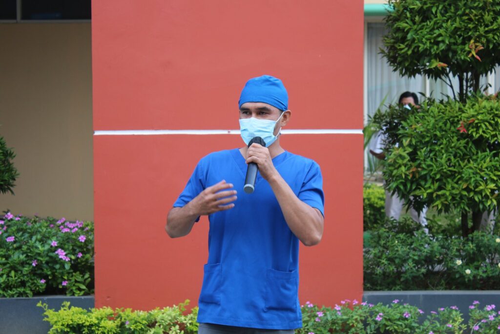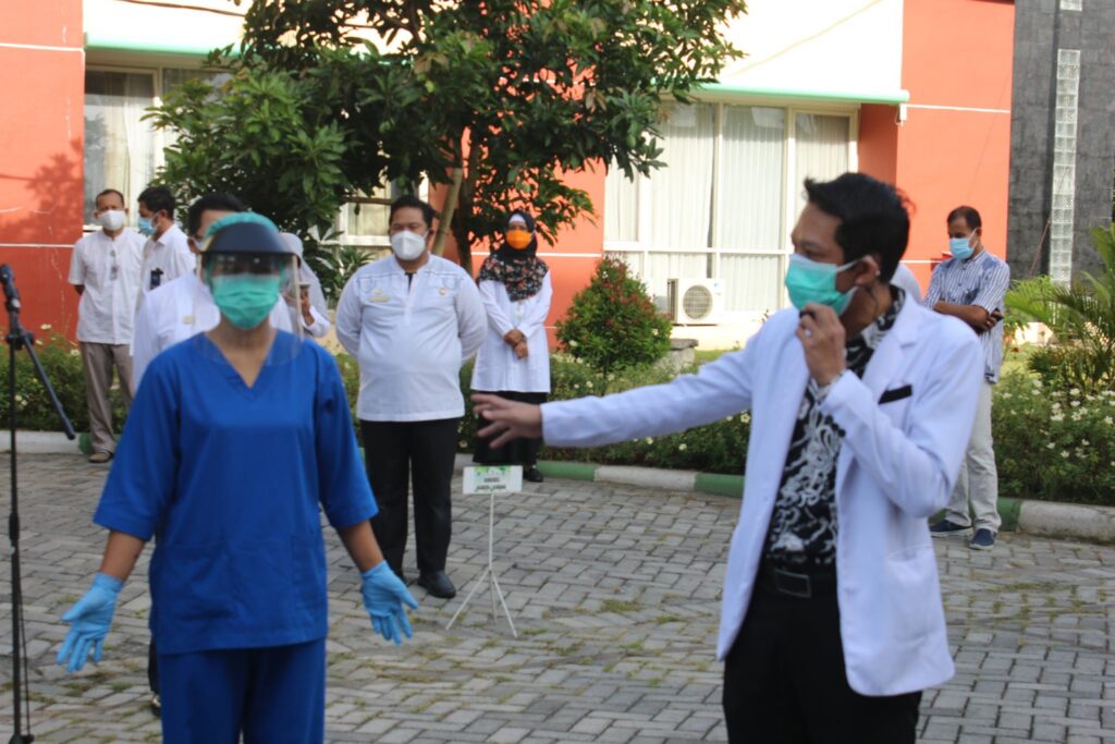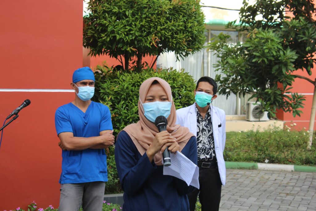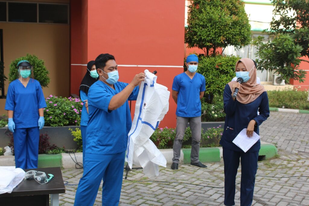 Hari ini (09 September 2020) giliran Instalasi Rawat Inap (IRNA) yang mengisi apel pagi berbahasa Inggris. Adapun tema yang diangkat oleh Kepala Instalasi Rawat Inap, dr. Adi Wira dan tim adalah “Pemakaian dan Pelepasan Alat Pelindung Diri (APD)”.