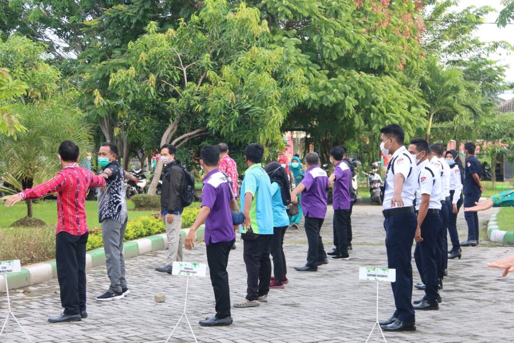 Untuk memastikan jarak antara peserta apel, dalam persiapan barisan dilakukan pengaturan jarak antar peserta seperti yang terlihat pada kolase foto di bawah ini.