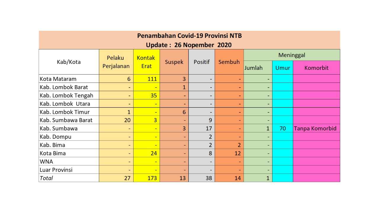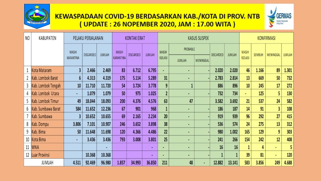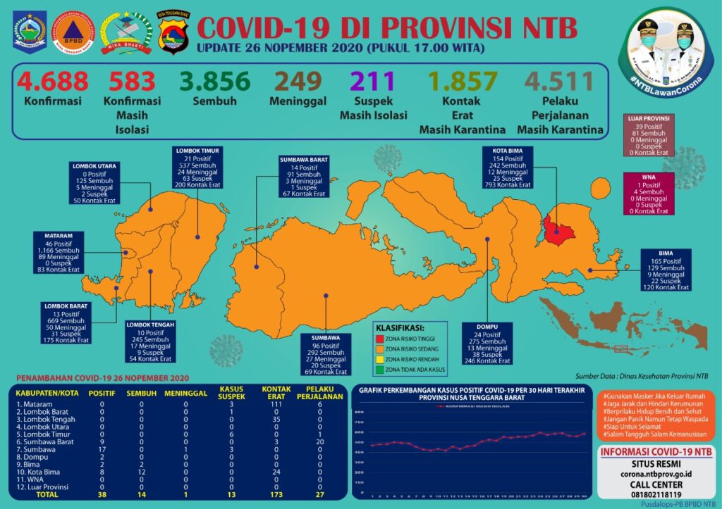 Update Perkembangan Covid 19 di Provinsi NTB, Edisi 26 November 2020 November 26, 2020November 26, 2020 admin Selengkapnya di : https://corona.ntbprov.go.id/