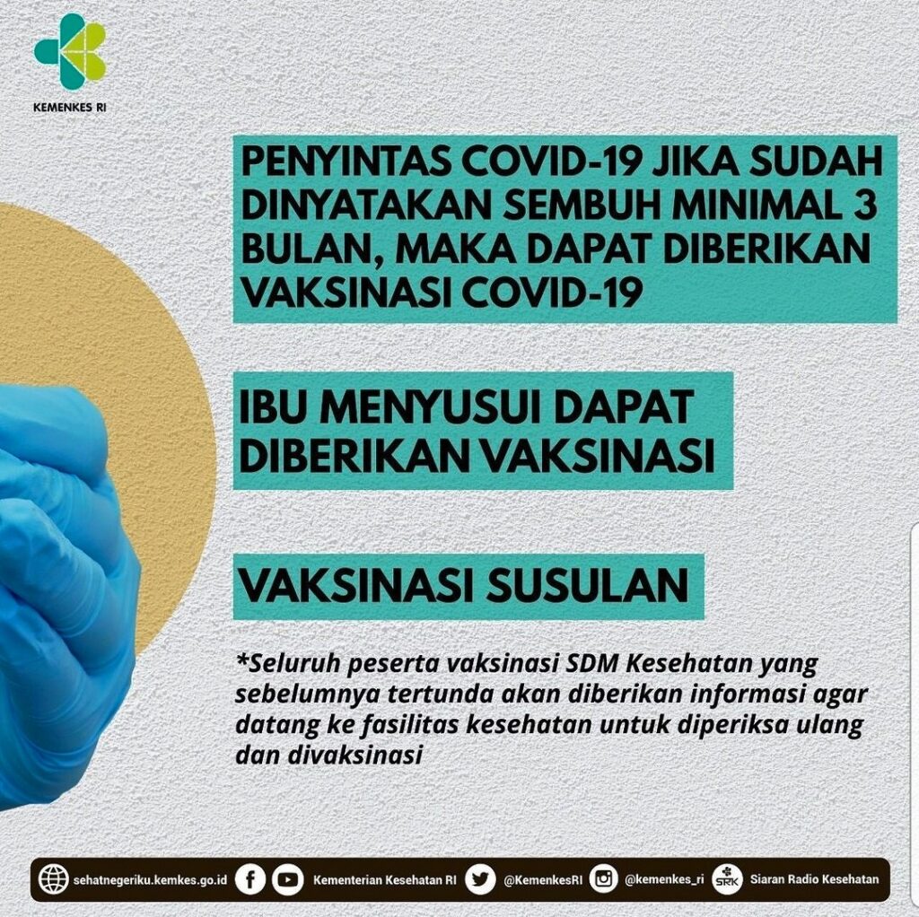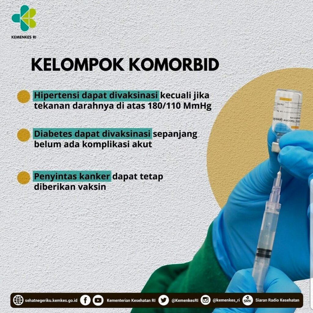 Pemerintah secara resmi mengizinkan pemberian Vaksin Covid-19 bagi kelompok usia 60 tahun ke atas, komorbid, penyintas Covid-19 dan ibu menyusui dengan terlebih dahulu dilakukan anamnesa dan skrining tambahan.