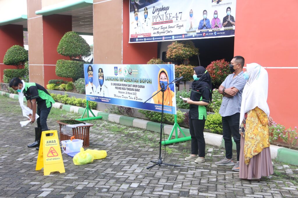 Dihadapan Direktur dr. H. Lalu Herman Mahaputra, M.Kes, MH dan disaksikan peserta apel “English Day” Petugas Cleaning Service dengan cekatan memperagakan penggunaan Spilkit untuk penanganan tumbahan cairan tubuh pasien .