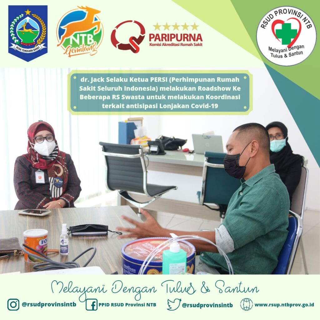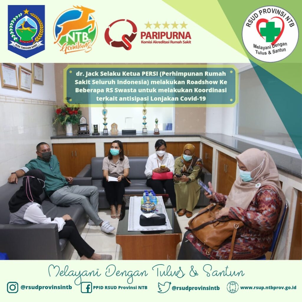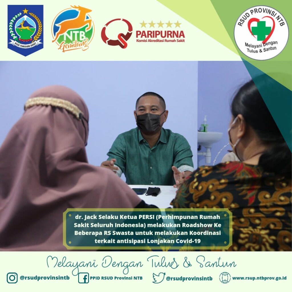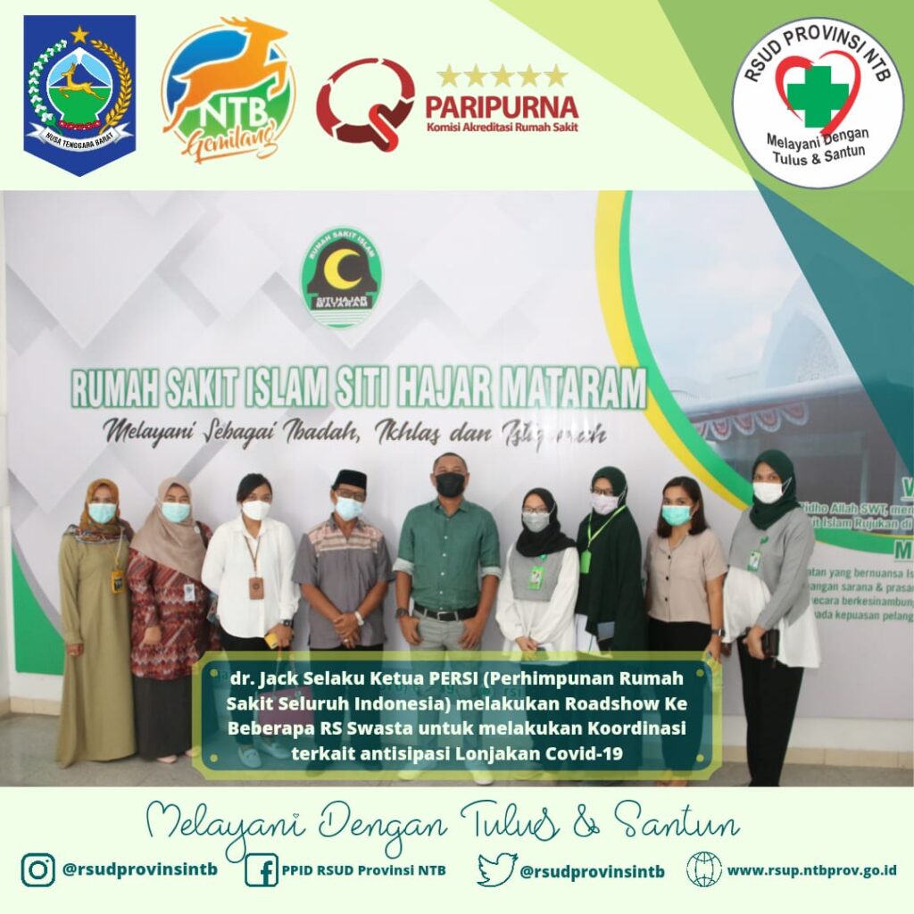 MATARAM (15/06) Direktur RSUD Provinsi NTB, dr. H. Lalu Herman Mahaputra, M.Kes, MH yang biasa disapa “dr Jack” selaku Ketua PERSI (Perhimpunan Rumah Sakit Seluruh Indonesia) Nusa Tenggara Barat hari ini bersama Pengurus PERSI melakukan RoadShow ke Beberapa Rumah Sakit Swasta di Kota Mataram yaitu RS. Metro Medika, RS Harapan Keluarga, Rumah Sakit Islam dan RS. Siloam.