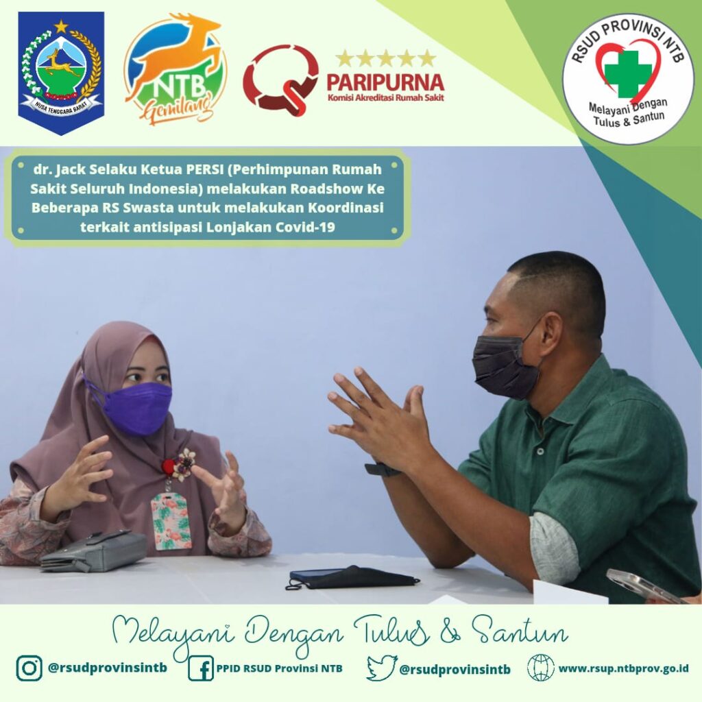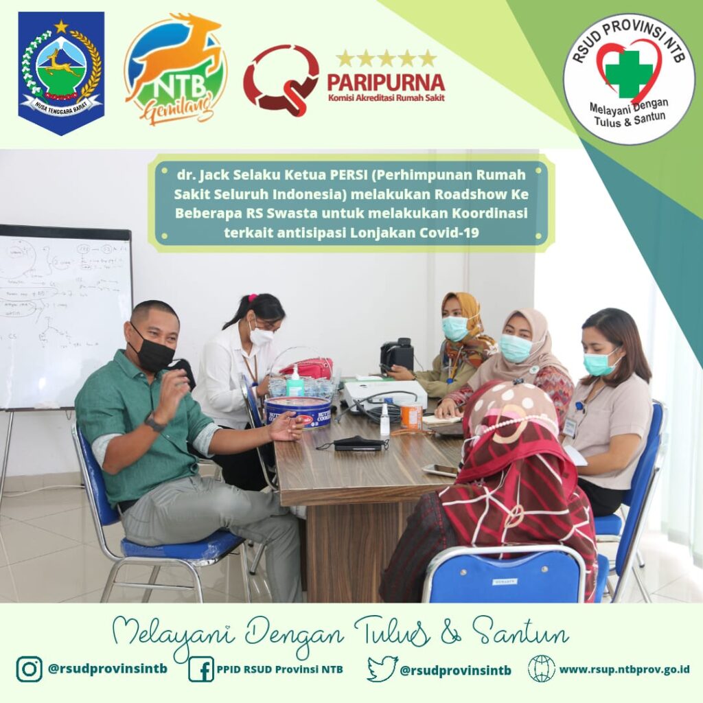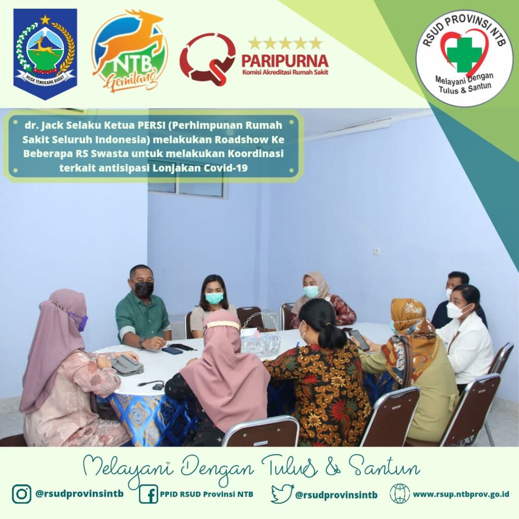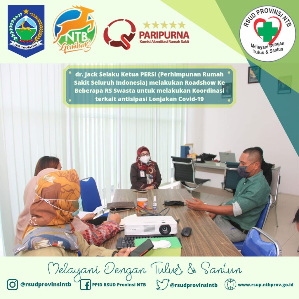 MATARAM (15/06) Direktur RSUD Provinsi NTB, dr. H. Lalu Herman Mahaputra, M.Kes, MH yang biasa disapa “dr Jack” selaku Ketua PERSI (Perhimpunan Rumah Sakit Seluruh Indonesia) Nusa Tenggara Barat hari ini bersama Pengurus PERSI melakukan RoadShow ke Beberapa Rumah Sakit Swasta di Kota Mataram yaitu RS. Metro Medika, RS Harapan Keluarga, Rumah Sakit Islam dan RS. Siloam.