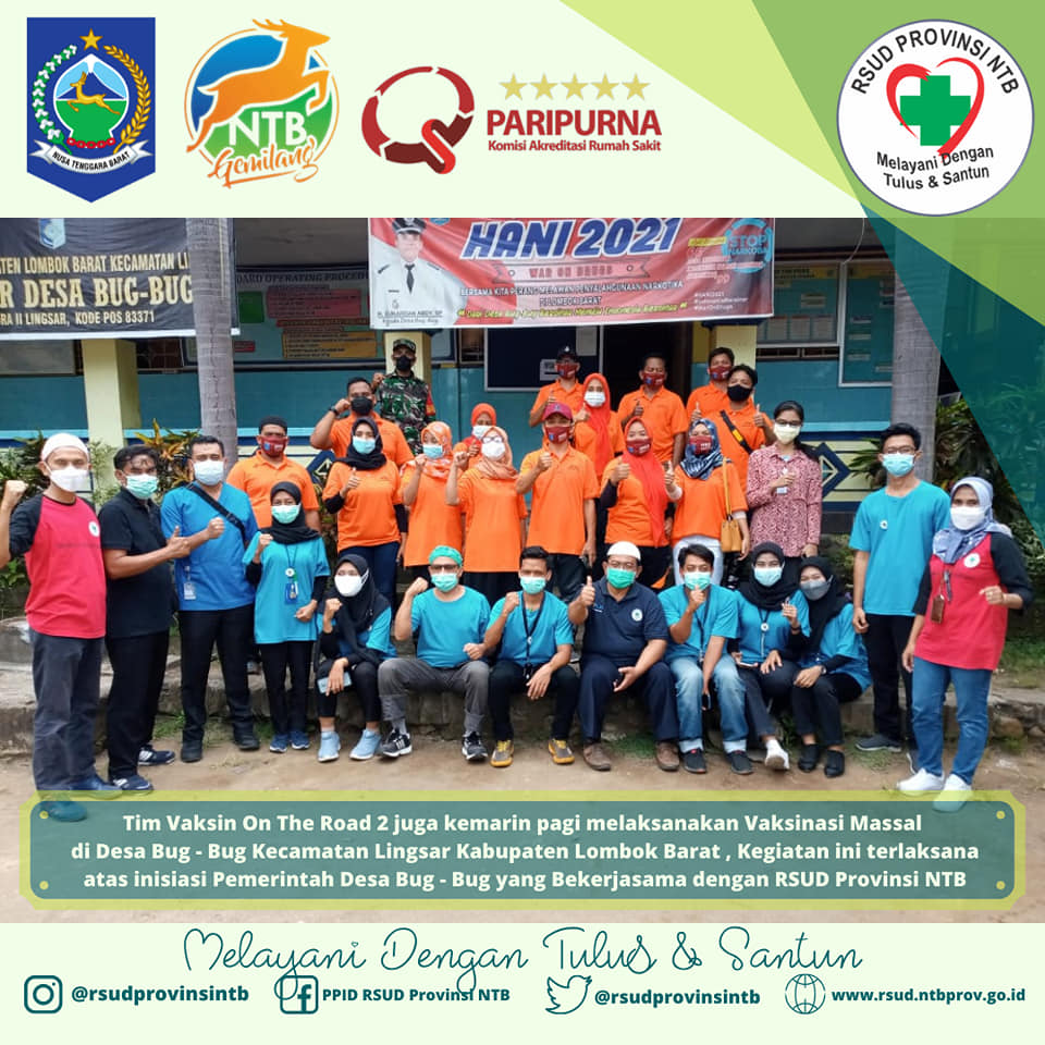 Tim Vaksin On The Road 2 juga kemarin pagi melaksanakan Vaksinasi Massal di Desa Bug – Bug Kecamatan Lingsar Kabupaten Lombok Barat. Kegiatan yang di inisiasi oleh Pemerintah Desa Bug – Bug dan bekerjasama dengan RSUD Provinsi NTB ini mendapatkan respon yang luar biasa dari Masyarakat, hal ini dapat dilihat dari antusiasme Masyarakat yang hadir untuk mendapatkan Vaksin Covid-19.