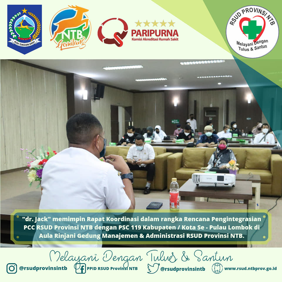 Bertempat di Aula Rinjani Gedung Manajemen dan Administrasi RSUD Provinsi NTB pagi ini dr. Jack memimpin Rapat Koordinasi terkait rencana Integrasi Province Comand Center RSUD Provinsi NTB dengan Public Safety Center 119 milik seluruh Kabupaten/Kota se-Pulau Lombok dan kedepannya akan dijalin kerjasama dengan PSC 119 Se-NTB, kerja bersama ini sangat dibutuhkan agar kita bisa memberikan Pelayanan Kesehatan kepada Seluruh Masyarakat Nusa Tenggara Barat dengan lebih baik lagi.