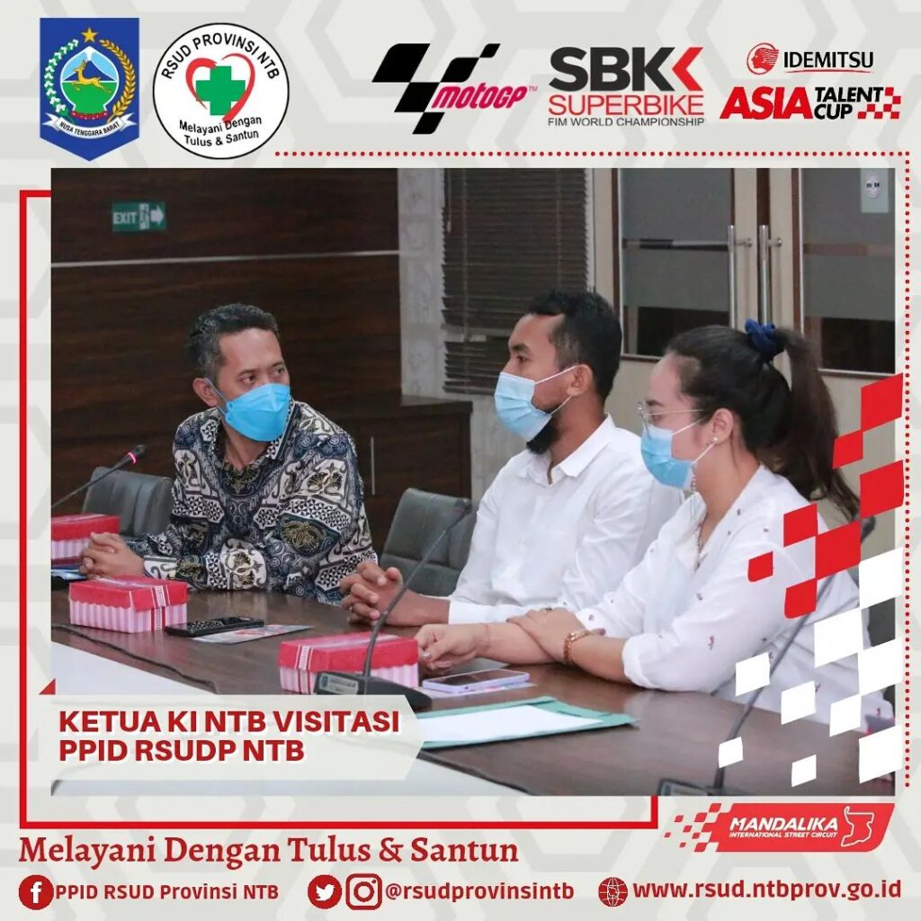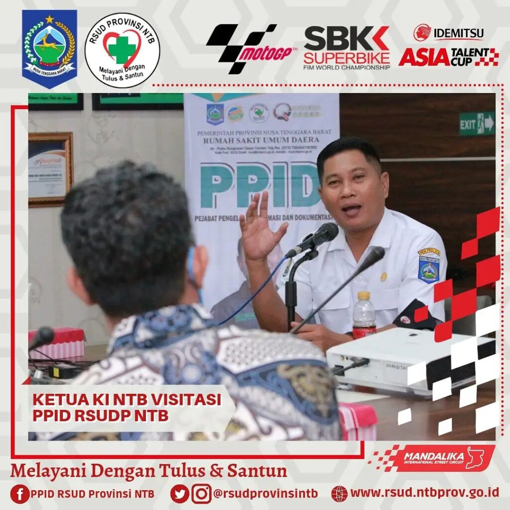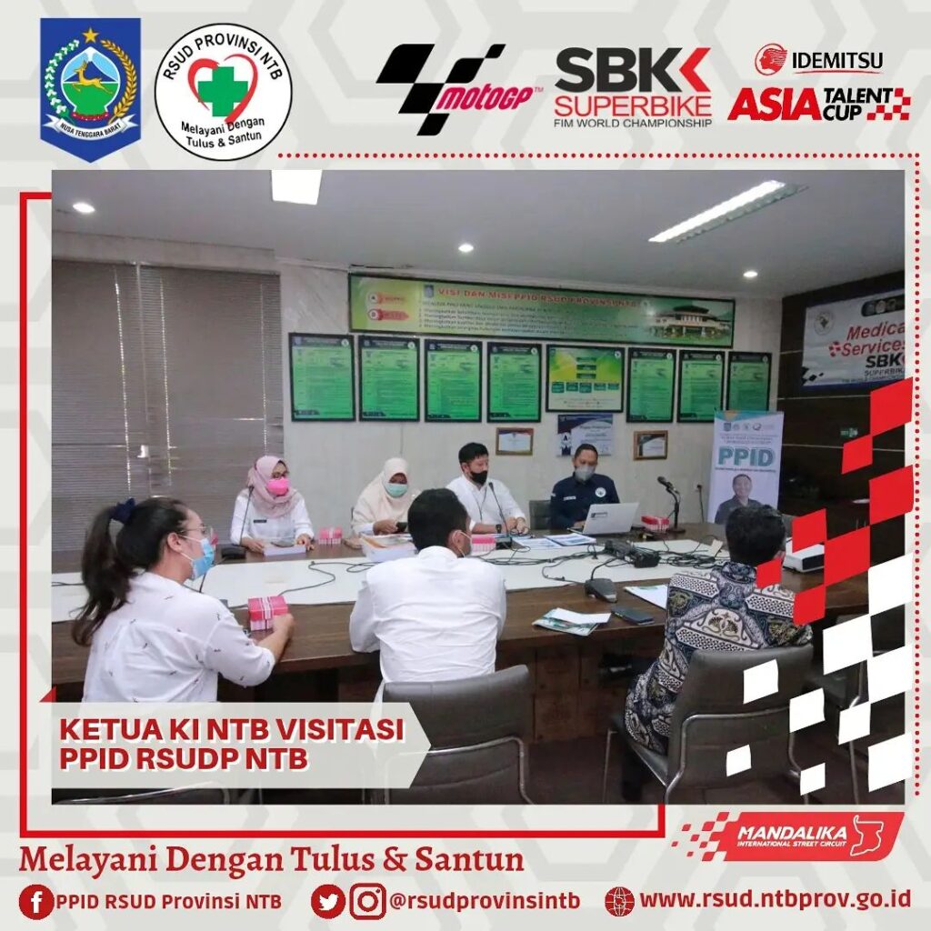 Ketua Komisi Informasi Nusa Tenggara Barat bersama Tim pagi ini melaksanakan Visitasi Dalam Rangka Penilaian Monitoring dan Evaluasi Keterbukaan Publik PPID RSUD Provinsi NTB, bertempat di Media Center Gedung Manajemen dan Administrasi Kasubag Hukum dan Humas mengawali pemaparan tentang apa yang telah dan yang akan dilakukan PPID RSUDP NTB, dikuatkan lagi oleh pemaparan Wakil Direktur Umum dan Keuangan yang menyampaikan tentang beberapa layanan unggulan.