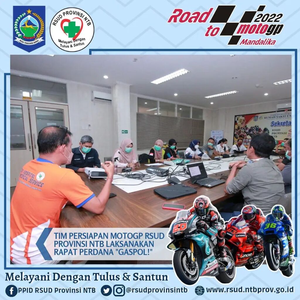 Bertempat di Media Center yang juga difungsikan sebagai Sekretariat Persiapan MotoGP pagi ini dilaksanakan Rapat Perdana Tim persiapan MotoGP Tahun 2022 yang di pimpin oleh Kepala Bidang Pelayanan RSUD Provinsi NTB.