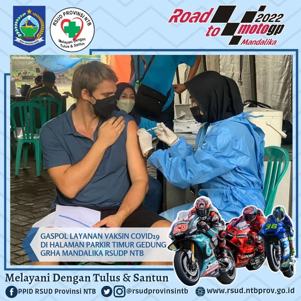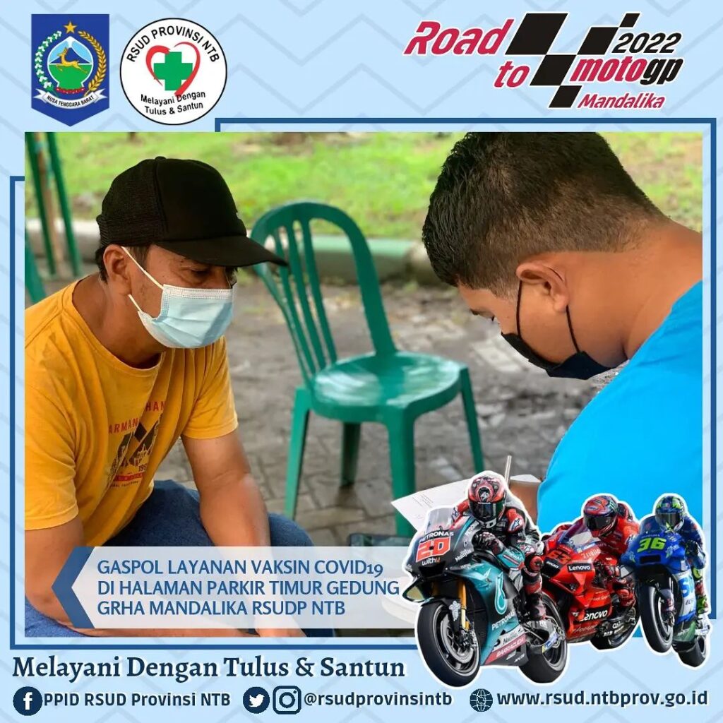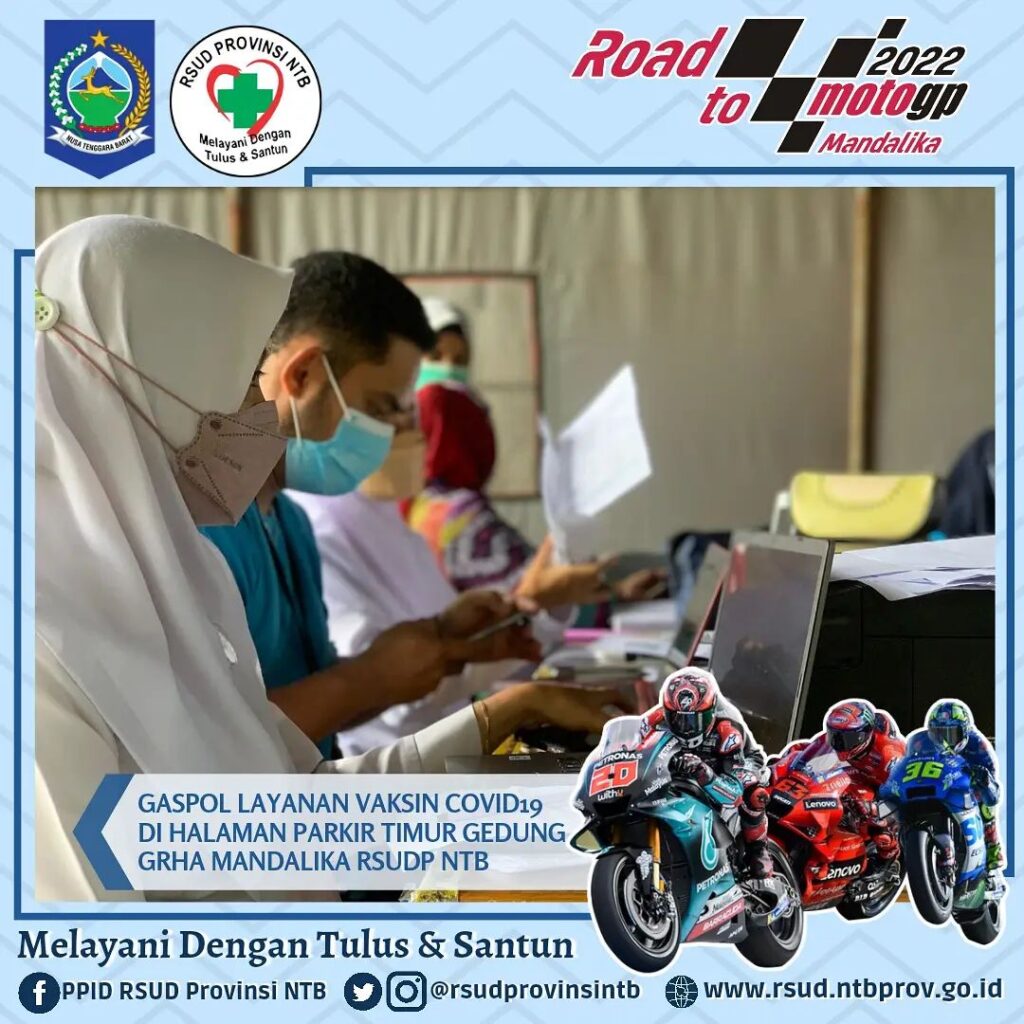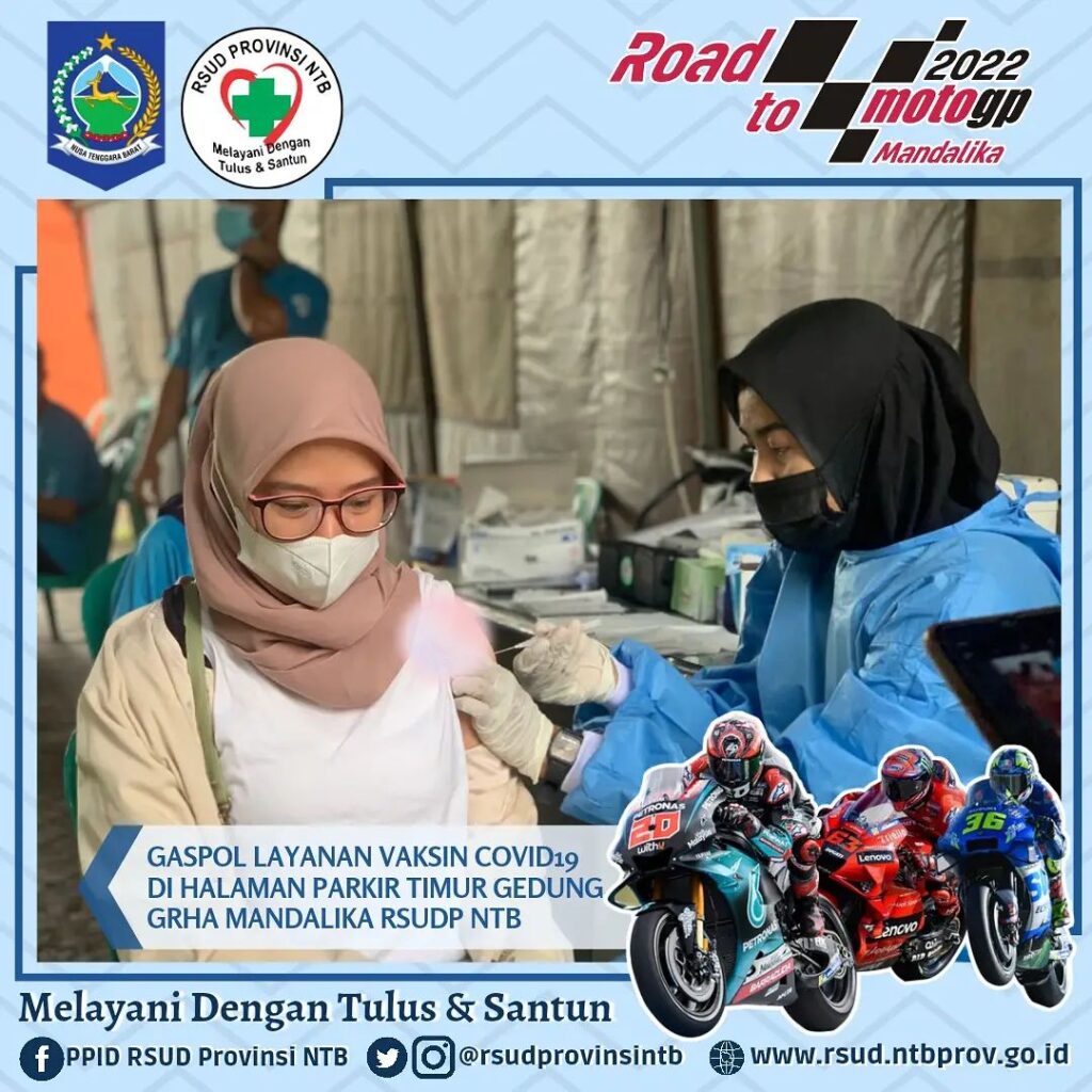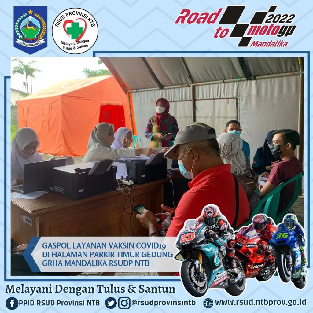 Bertempat di Halaman Parkir Timur Gedung Grha Mandalika RSUD Provinsi Nusa Tenggara Barat Pelayanan Vaksinasi Covid-19 dengan jenis Sinovac, Astrazeneca dan Moderna tetap dilaksanakan, kegiatan ini berlangsung setiap Hari Senin – Sabtu mulai Pukul 08.00 hingga 11.00 WITA.