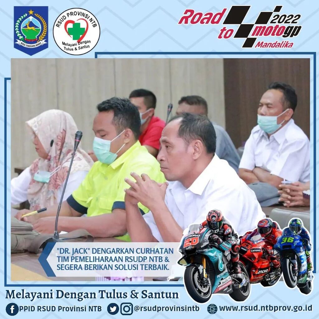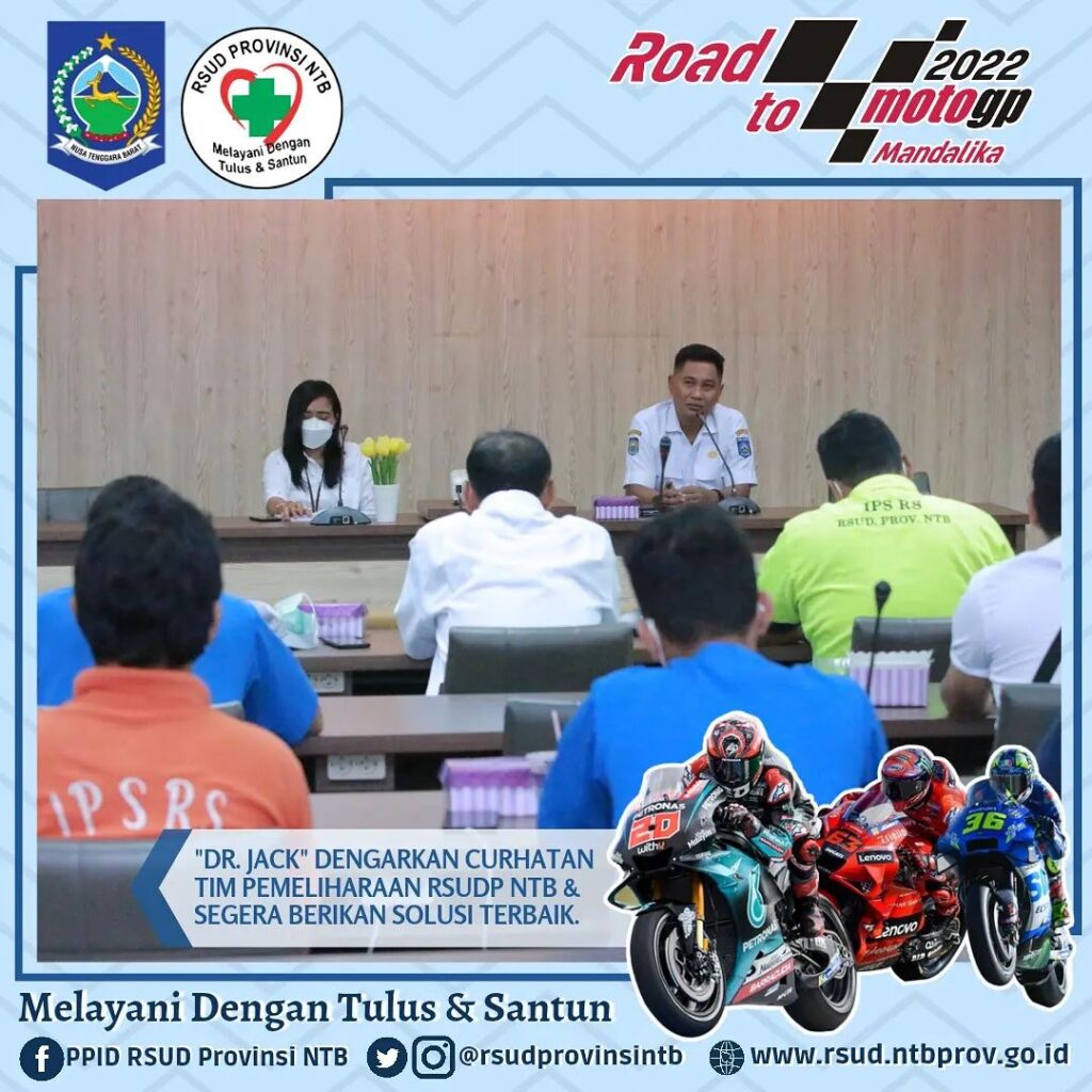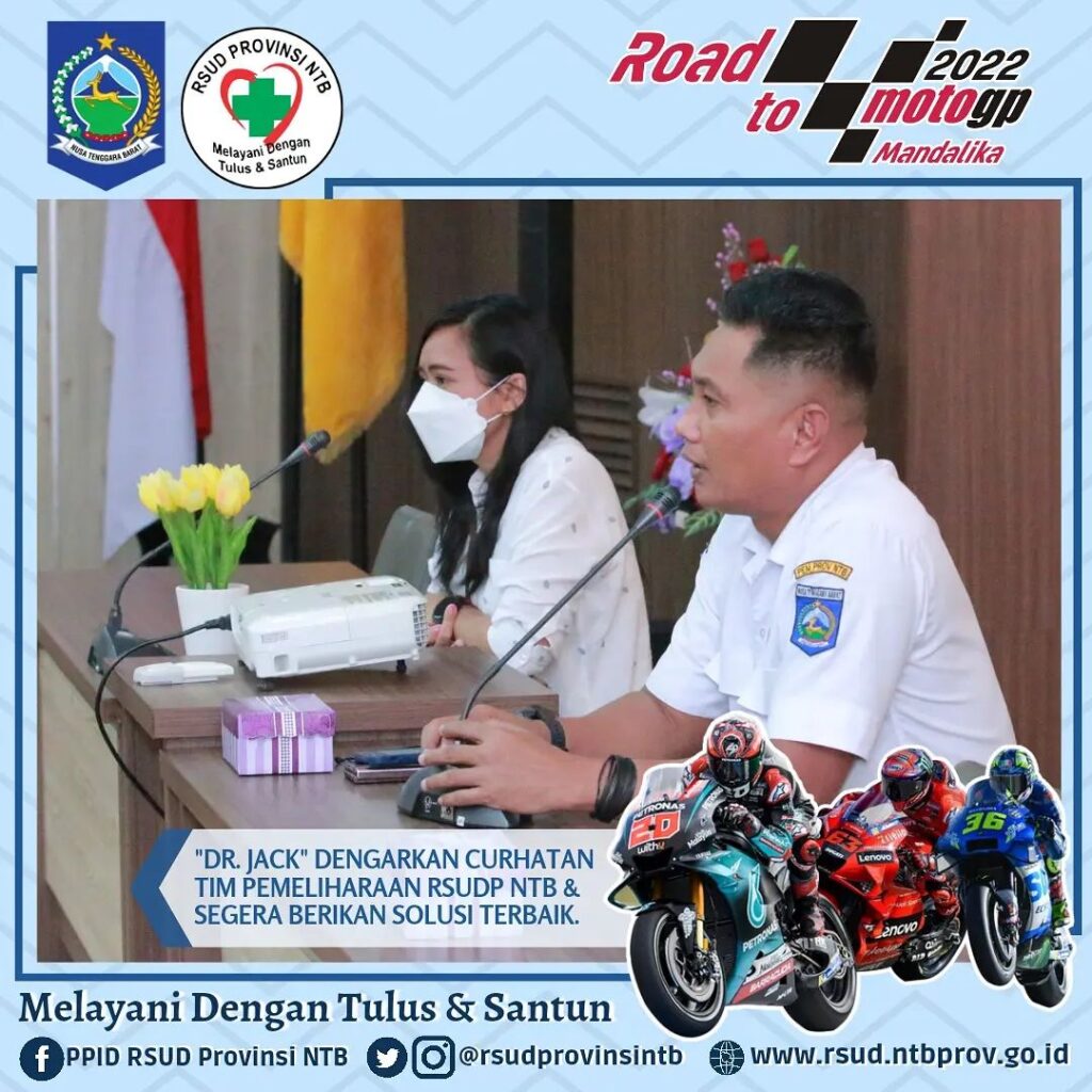 Atas inisiasi K3RS hari ini Tim Pemeliharaan RSUD Provinsi NTB langsung menyampaikan aspirasinya atau dalam bahasa kekinian “Curhat” kepada Direktur RSUD Provinsi NTB yang akrab disapa dr. Jack di Aula Rinjani Gedung Manajemen & Administrasi RSUD Provinsi NTB.