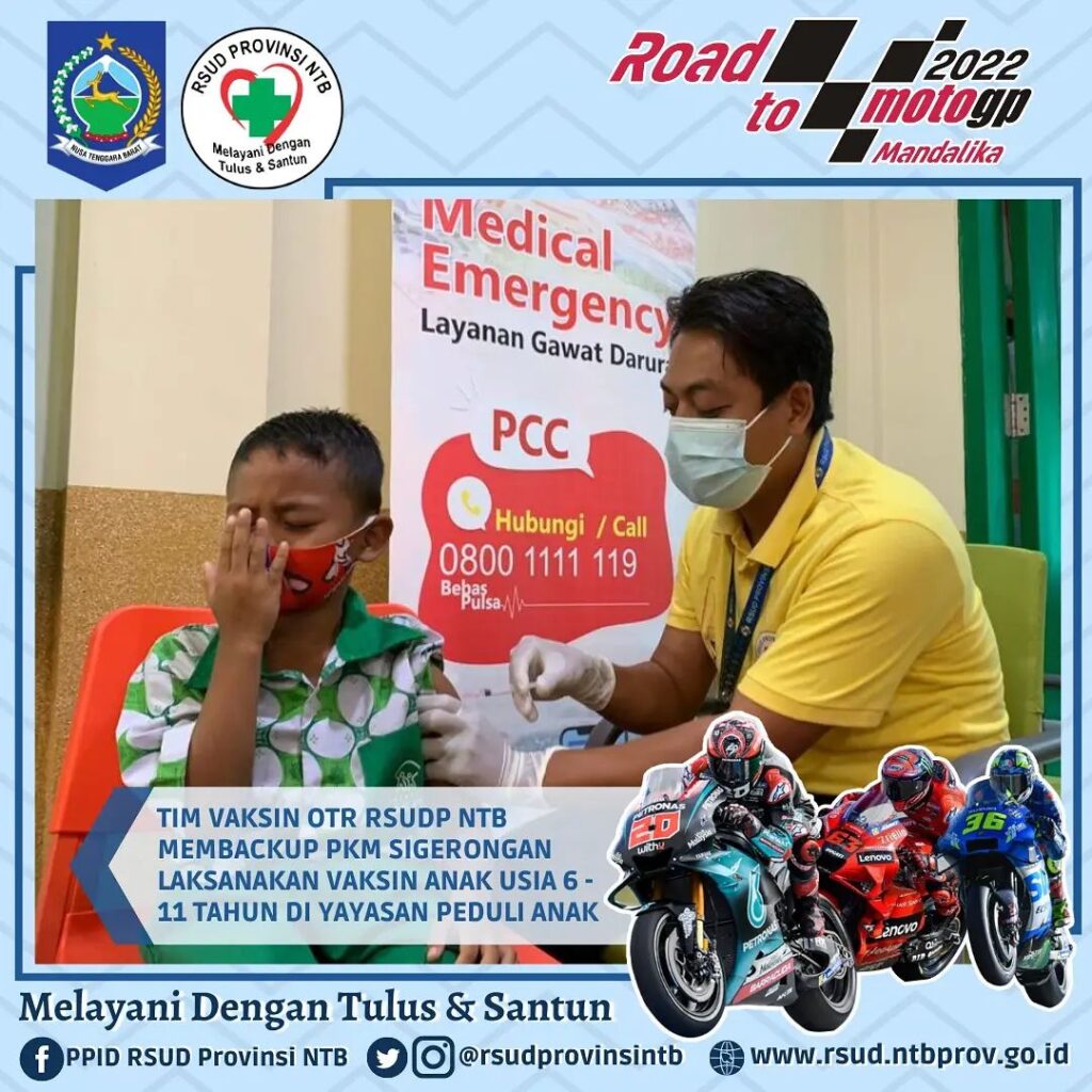 Memulai pelaksanaan Vaksin Anak Usia 6 – 11 Tahun Tim Vaksin On The Road RSUD Provinsi NTB membackup Puskesmas Sigerongan Kabupaten Lombok Barat untuk melaksanakan Vaksinasi anak di Yayasan Peduli Anak, Duman Kecamatan Lingsar, Kabupaten Lombok Barat.