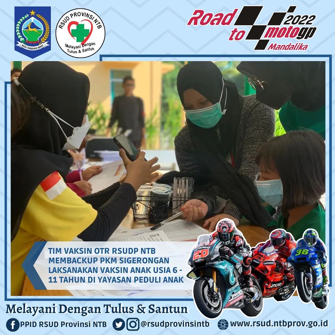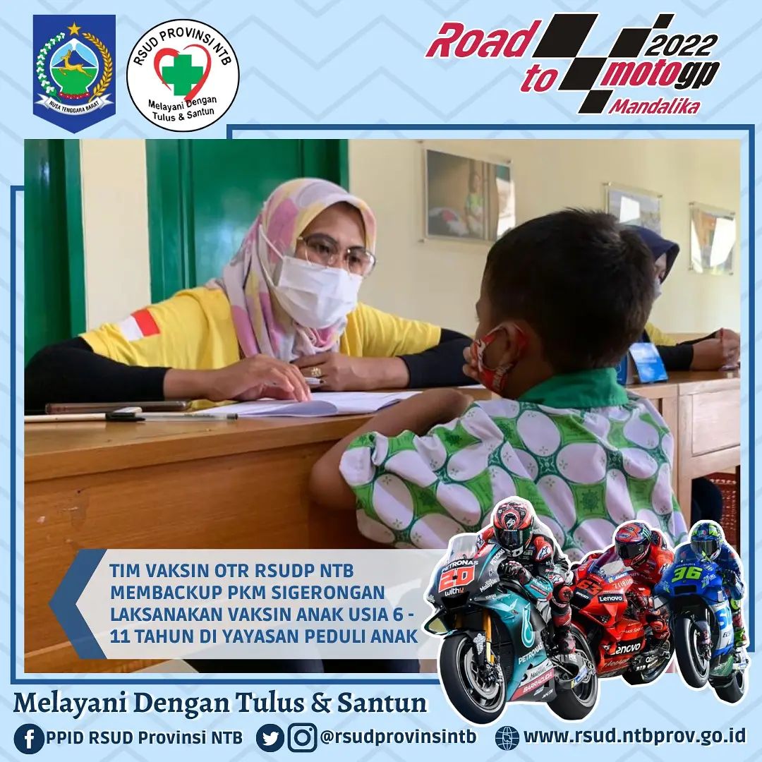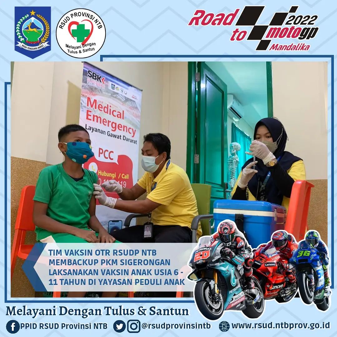 Memulai pelaksanaan Vaksin Anak Usia 6 – 11 Tahun Tim Vaksin On The Road RSUD Provinsi NTB membackup Puskesmas Sigerongan Kabupaten Lombok Barat untuk melaksanakan Vaksinasi anak di Yayasan Peduli Anak, Duman Kecamatan Lingsar, Kabupaten Lombok Barat.