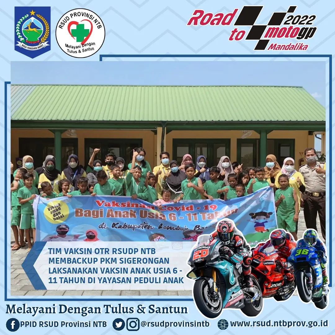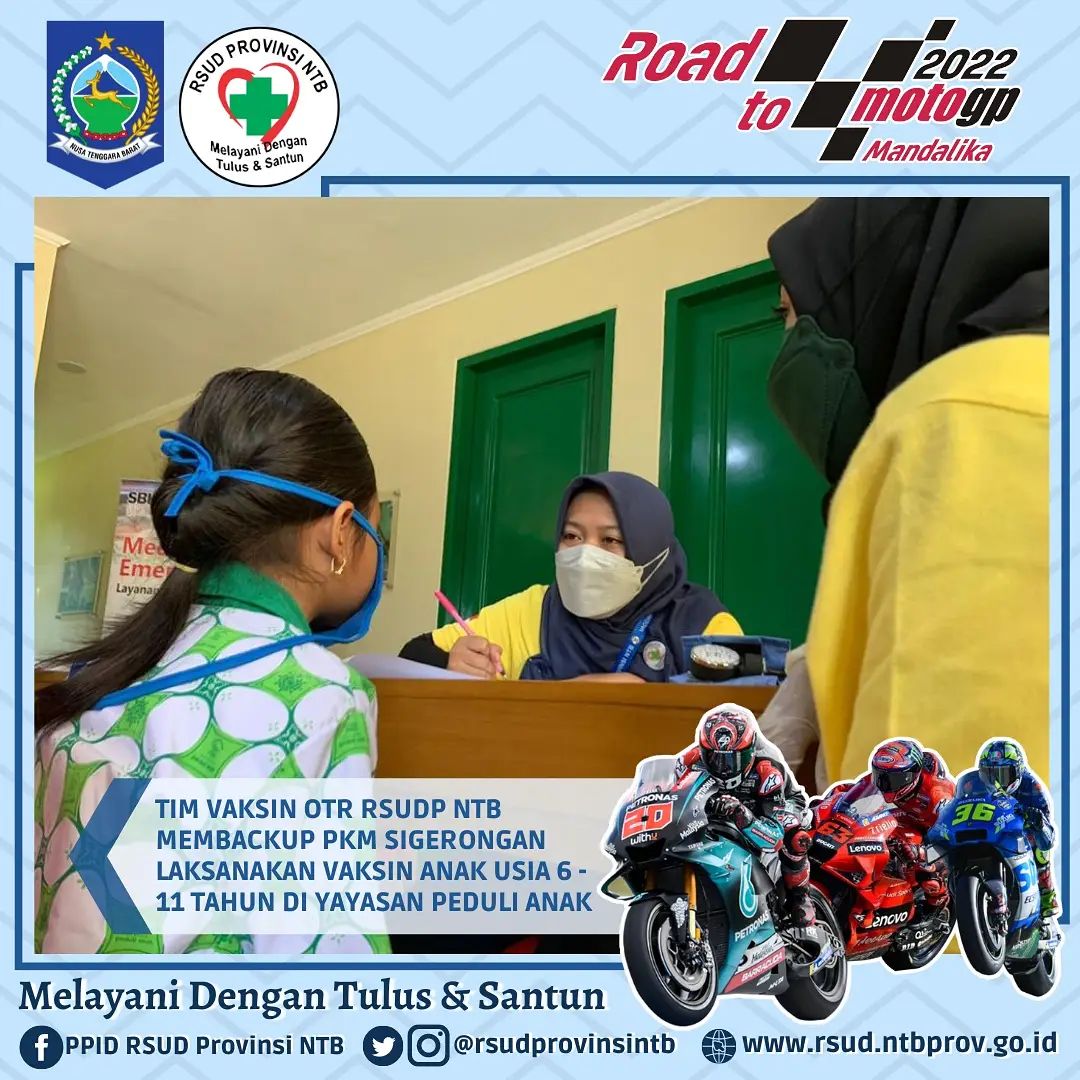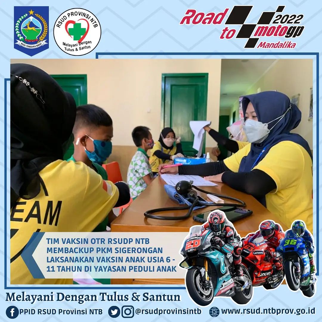 Memulai pelaksanaan Vaksin Anak Usia 6 – 11 Tahun Tim Vaksin On The Road RSUD Provinsi NTB membackup Puskesmas Sigerongan Kabupaten Lombok Barat untuk melaksanakan Vaksinasi anak di Yayasan Peduli Anak, Duman Kecamatan Lingsar, Kabupaten Lombok Barat.