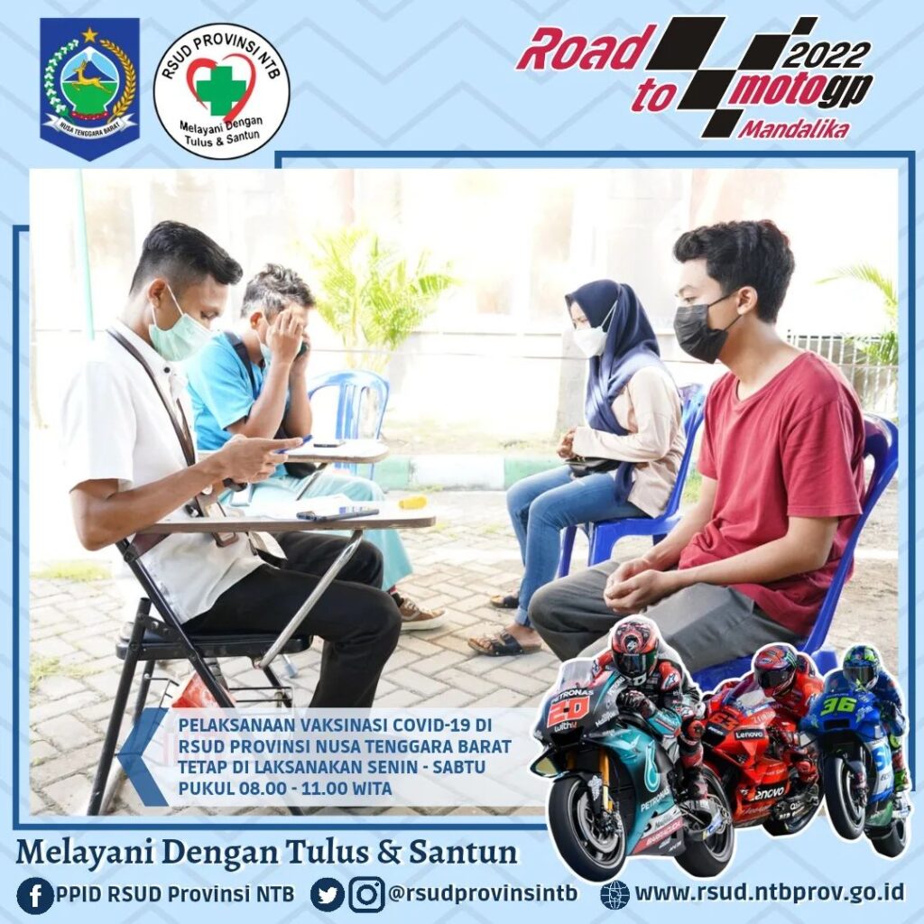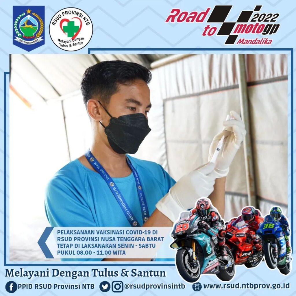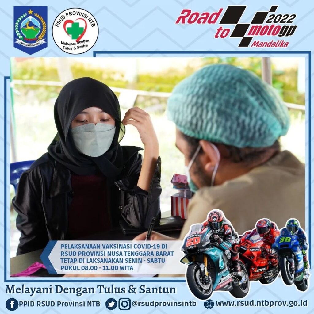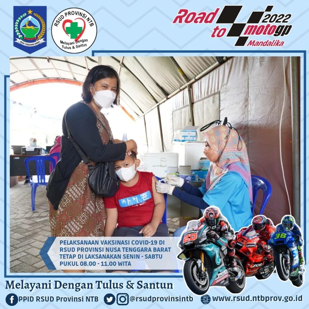 Pelaksanaan Vaksinasi Covid-19 RSUD Provinsi Nusa Tenggara Barat setiap hari Senin – Sabtu tetap berlangsung pada Jam Kerja (Pukul 08.00 – 11.00 WITA), kami melayani pelaksanaan Vaksin Anak 6 – 11 Tahun (Jenis Vaksin Sinovac) dan Vaksin usia 12 Tahun Keatas (jenis vaksin Sinovac, pfizer dan Moderna).