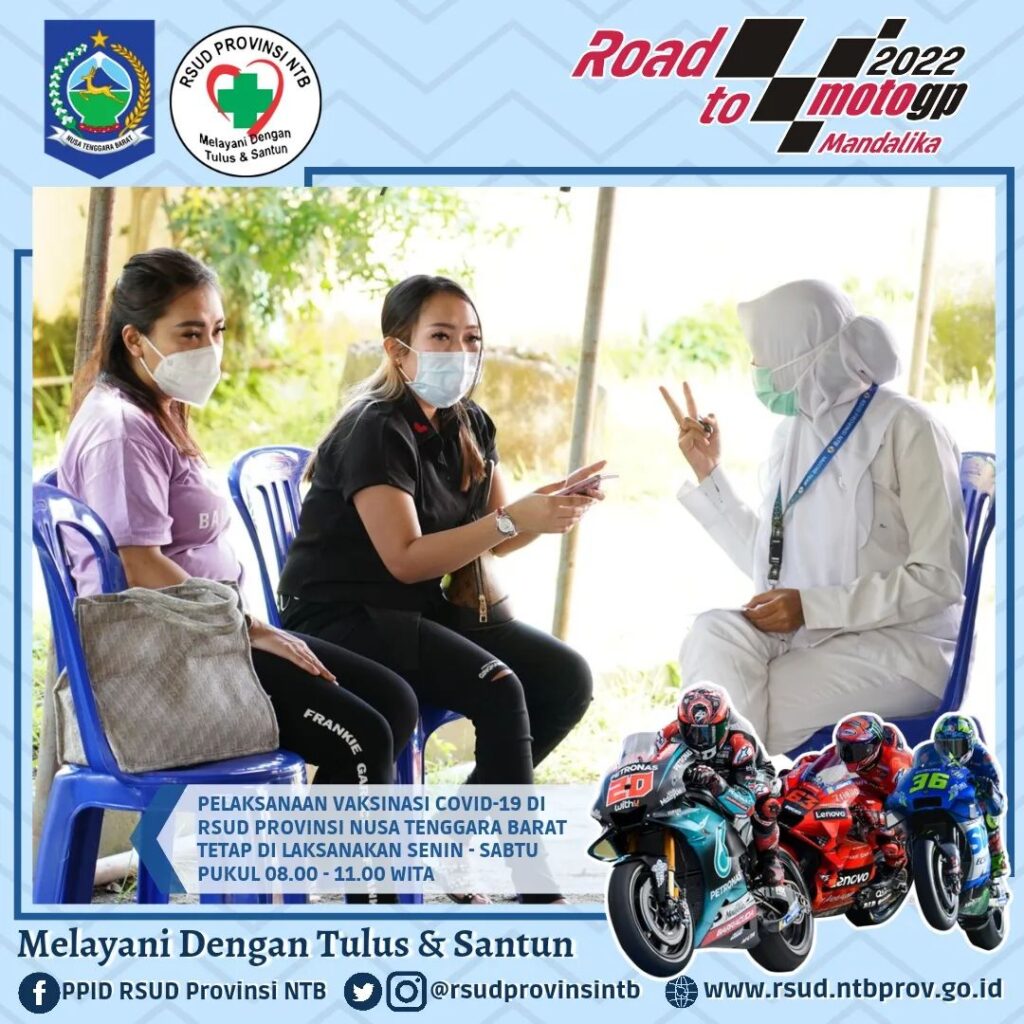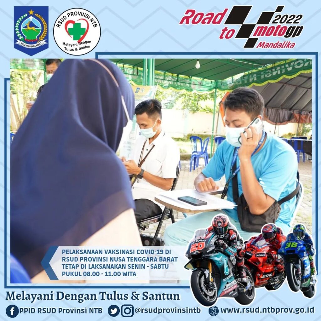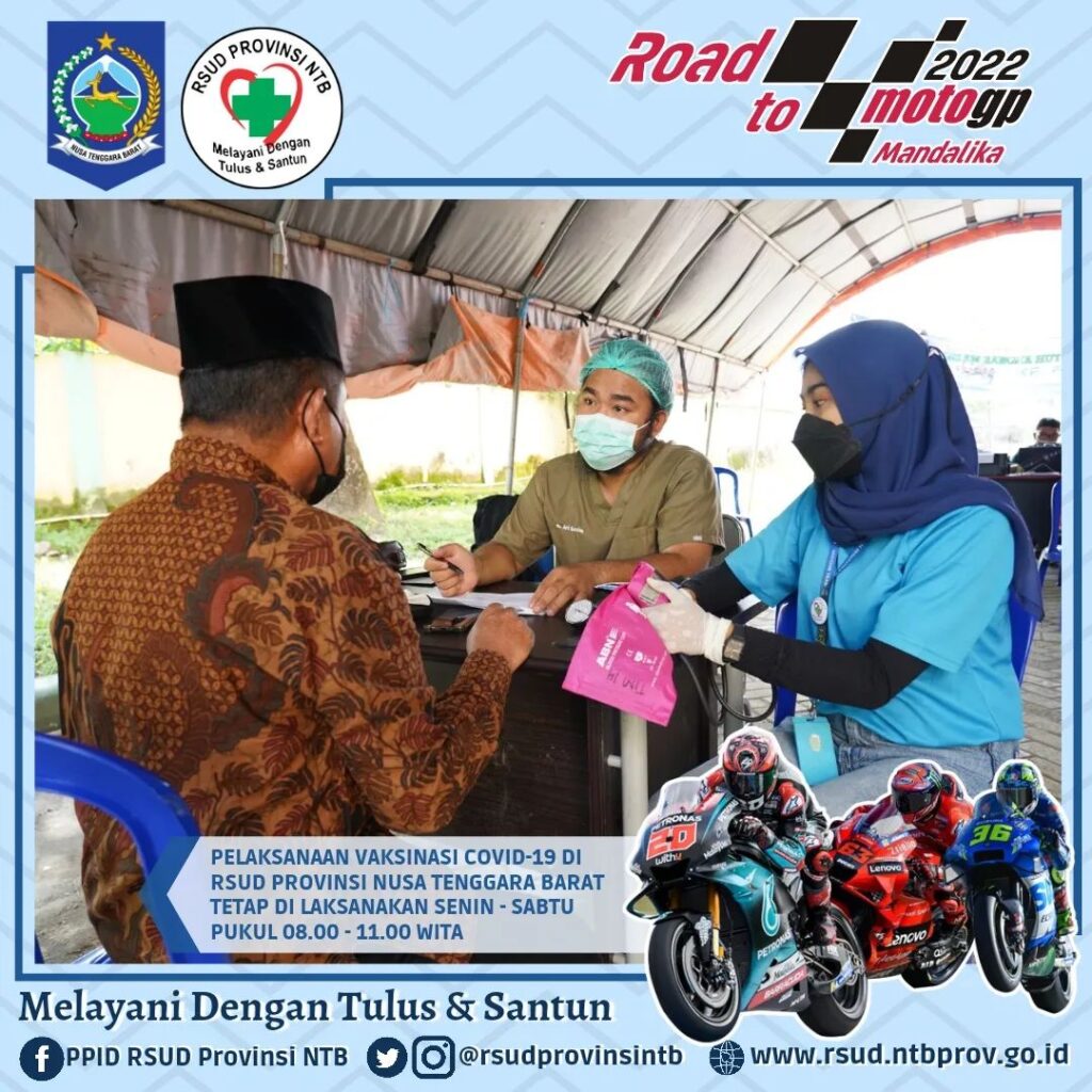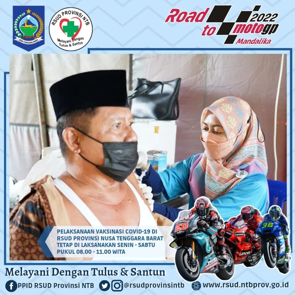 Pelaksanaan Vaksinasi Covid-19 RSUD Provinsi Nusa Tenggara Barat setiap hari Senin – Sabtu tetap berlangsung pada Jam Kerja (Pukul 08.00 – 11.00 WITA), kami melayani pelaksanaan Vaksin Anak 6 – 11 Tahun (Jenis Vaksin Sinovac) dan Vaksin usia 12 Tahun Keatas (jenis vaksin Sinovac, pfizer dan Moderna).