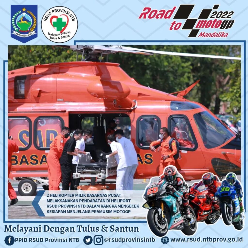 Menjelang pelaksanaan Event Tes Pra Musim MotoGP 2 Helikopter milik Basarnas melaksanakan kembali percobaan pendaratan di heliport milik RSUD Provinsi NTB, sekitar jam 10.30 dari arah selatan gedung IGD RSUD Provinsi NTB 2 Helikopter tersebut secara beriringan tiba dan satu persatu melaksanakan pendaratan di Heliport.