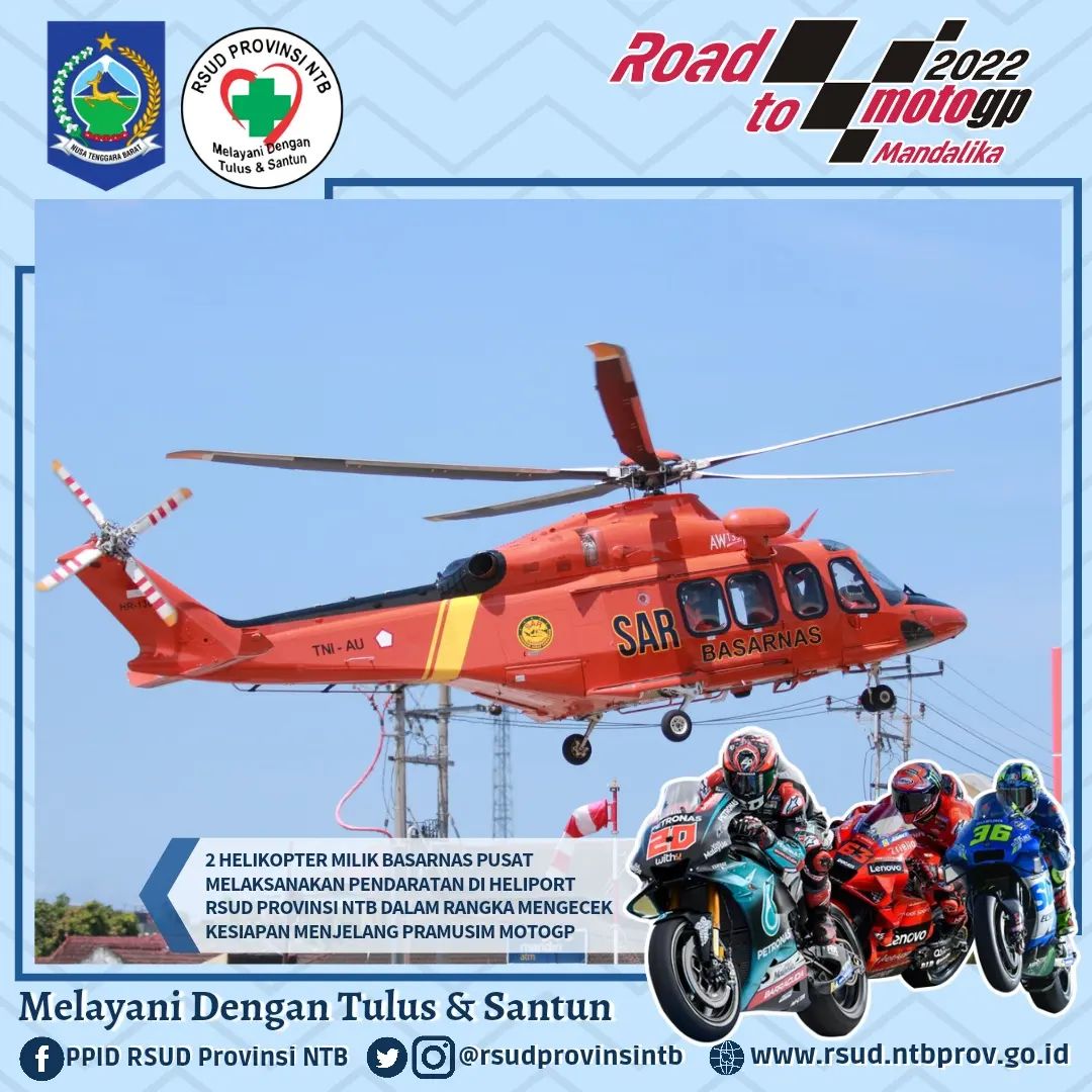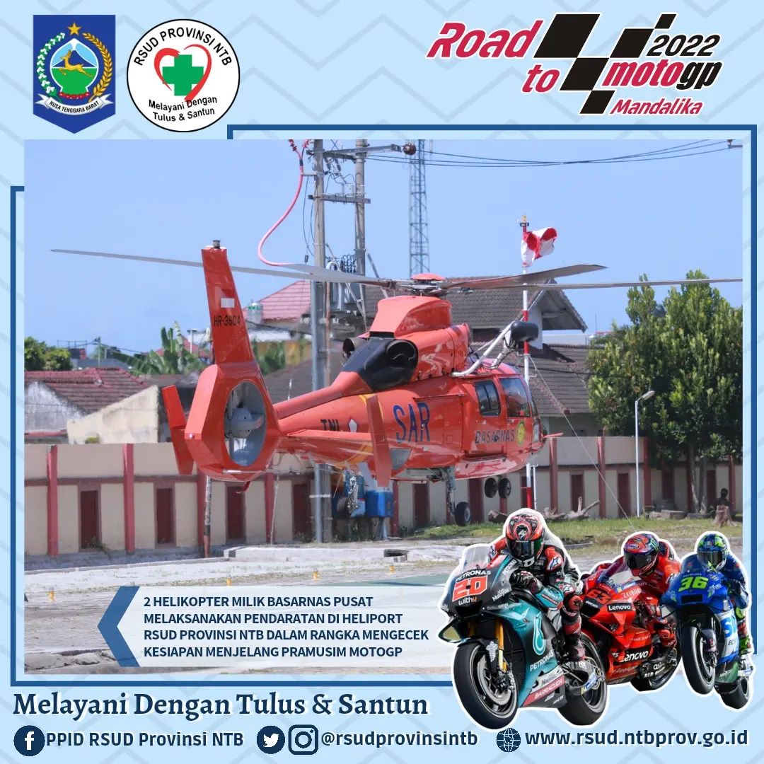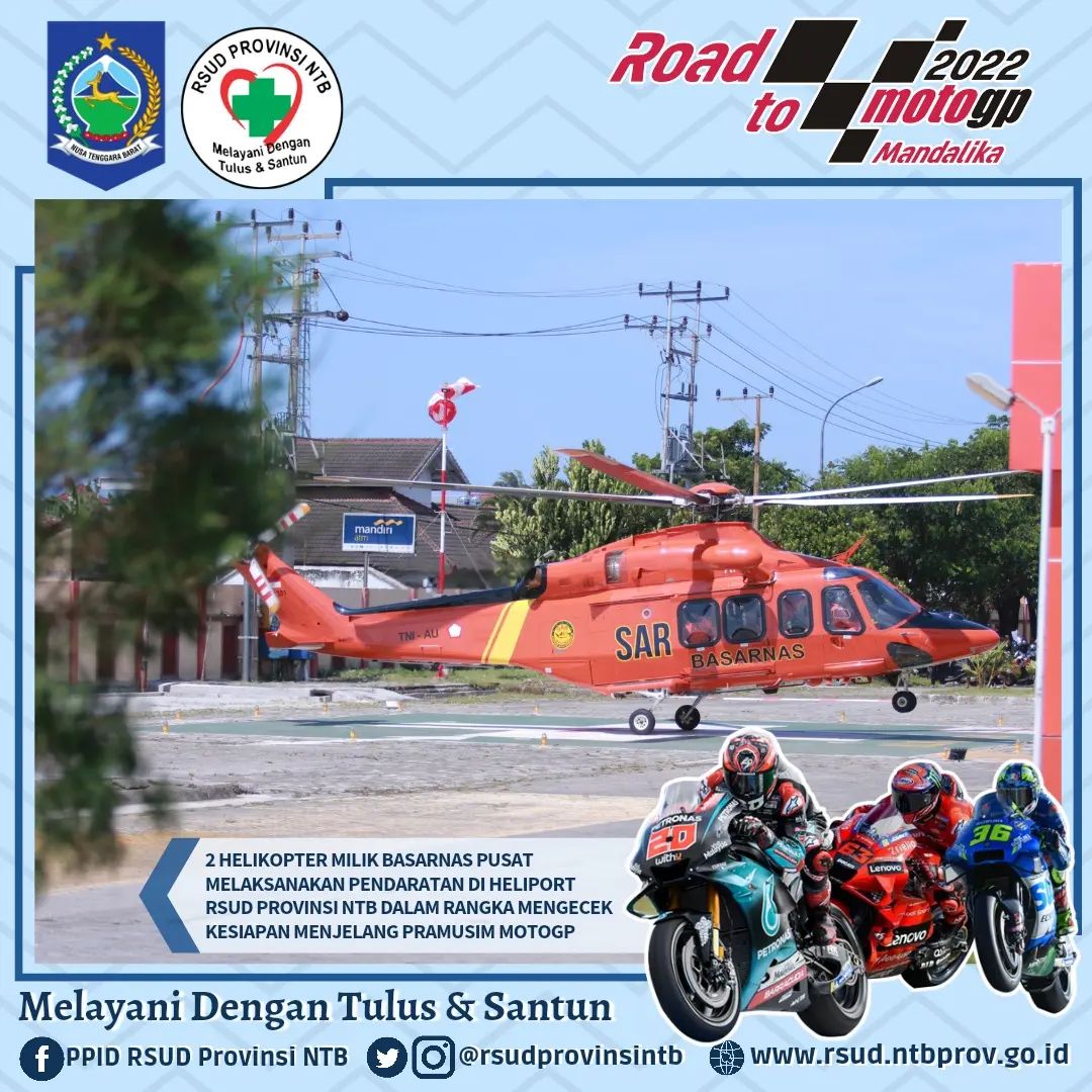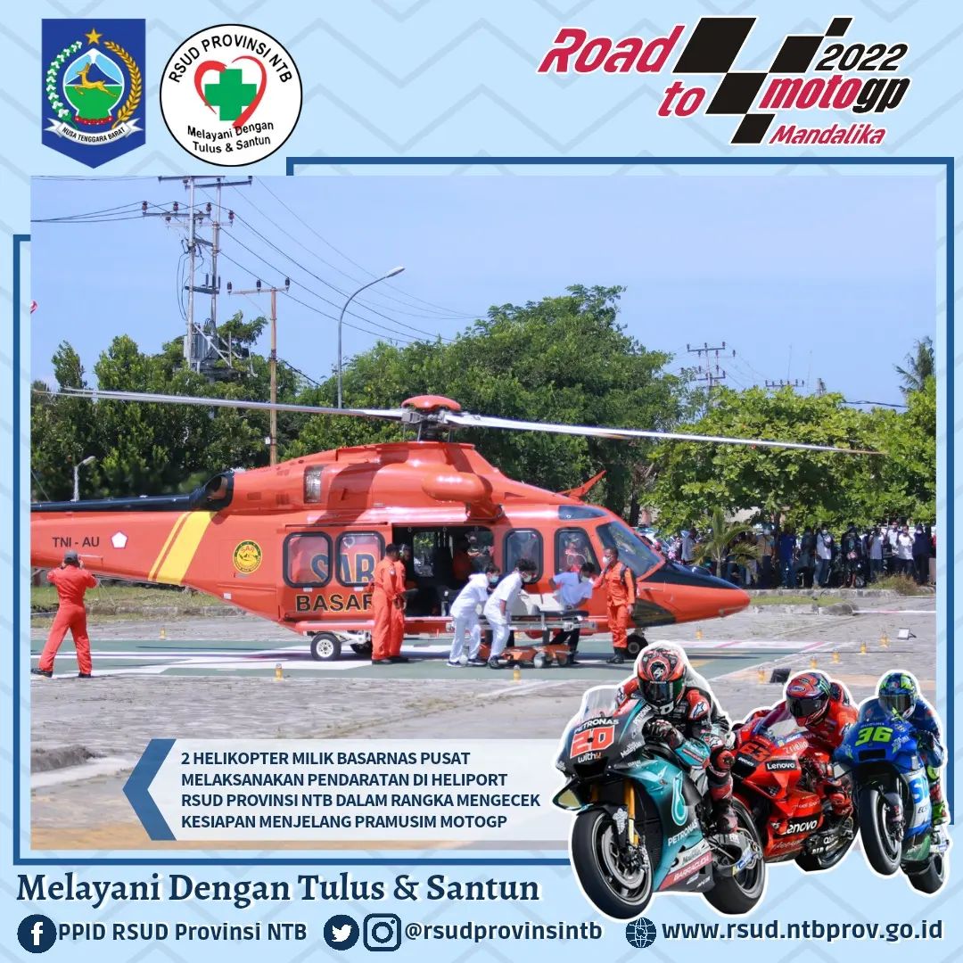 Menjelang pelaksanaan Event Tes Pra Musim MotoGP 2 Helikopter milik Basarnas melaksanakan kembali percobaan pendaratan di heliport milik RSUD Provinsi NTB, sekitar jam 10.30 dari arah selatan gedung IGD RSUD Provinsi NTB 2 Helikopter tersebut secara beriringan tiba dan satu persatu melaksanakan pendaratan di Heliport.