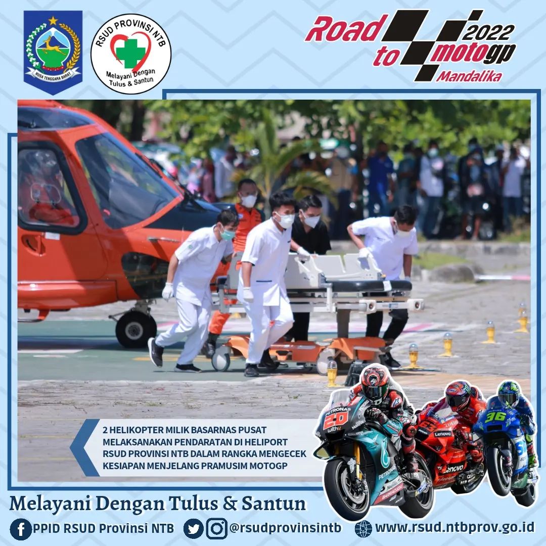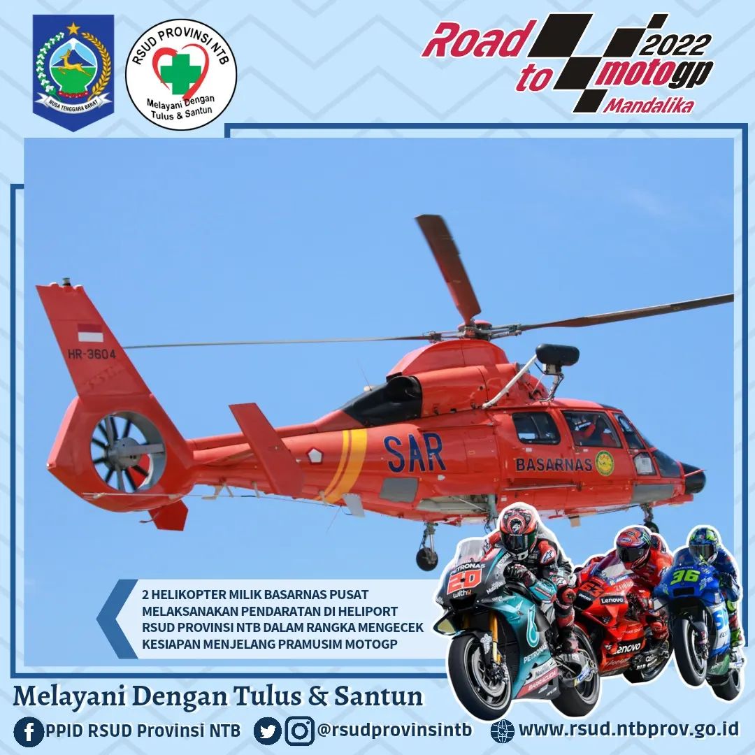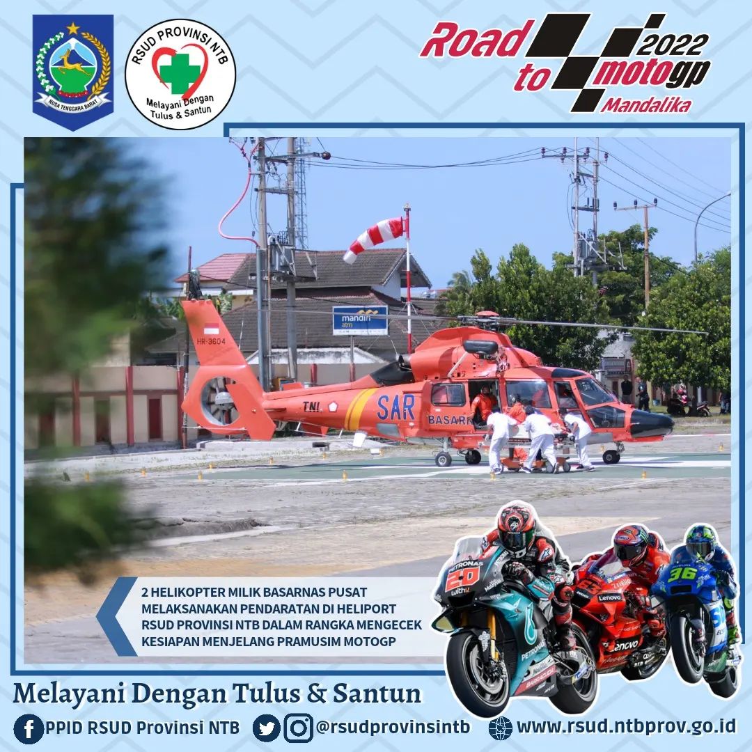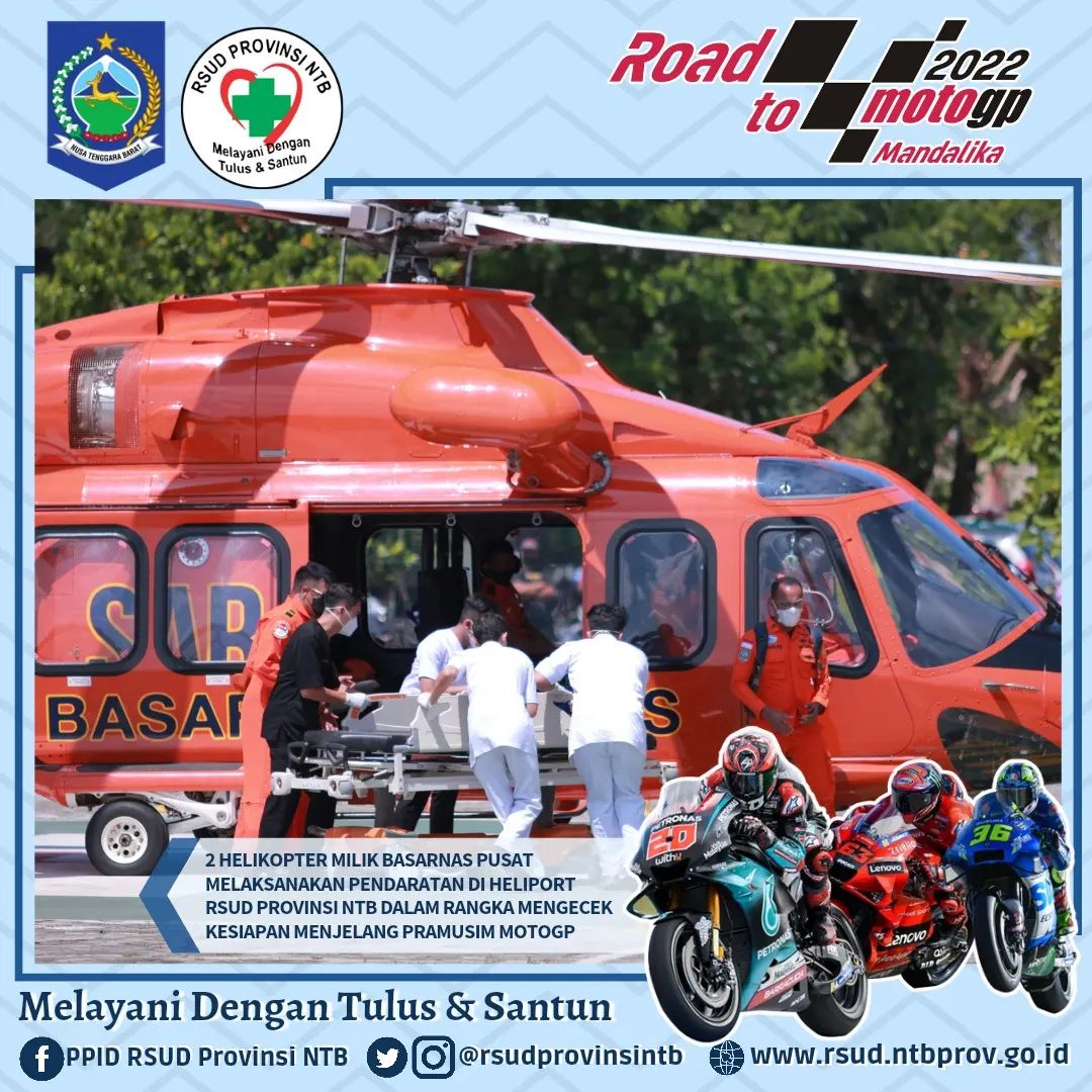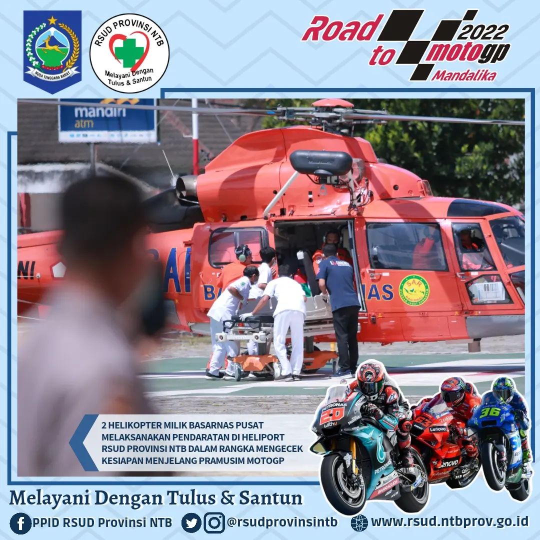 Menjelang pelaksanaan Event Tes Pra Musim MotoGP 2 Helikopter milik Basarnas melaksanakan kembali percobaan pendaratan di heliport milik RSUD Provinsi NTB, sekitar jam 10.30 dari arah selatan gedung IGD RSUD Provinsi NTB 2 Helikopter tersebut secara beriringan tiba dan satu persatu melaksanakan pendaratan di Heliport.