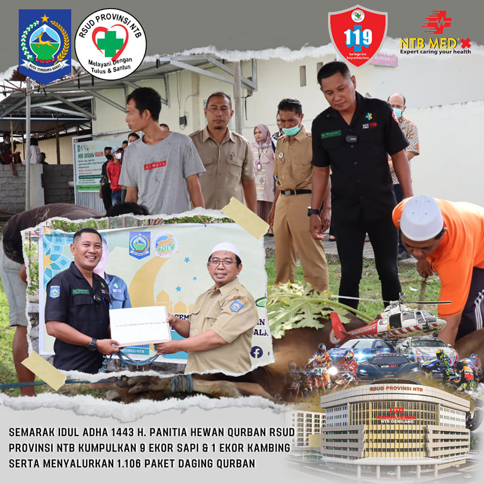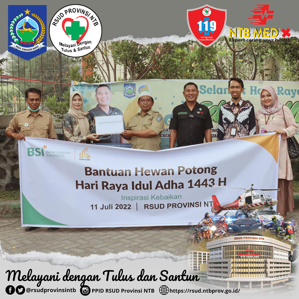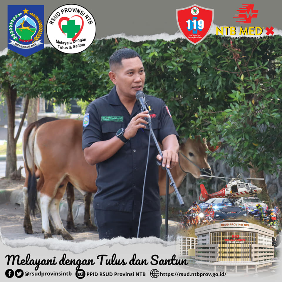 Sebagai rangkaian dari Semarak Hari Raya Idul Adha 1443 H. Tadi pagi dr. Jack menyerahkan 1 Ekor Sapi kepada Panitia Qurban RSUD Provinsi NTB, selain itu 8 Ekor Sapi dan 1 Ekor Kambing juga diserahkan dan berasal dari Civitas Hospotalia RSUD Provinsi NTB sebanyak 6 Ekor Sapi, 3 Ekor Sapi dan 1 Ekor Kambing lainnya berasal dari mitra RSUD Provinsi NTB yaitu Bank Syariah Indonesia, PT. DIU dan Auto Riset 2000)