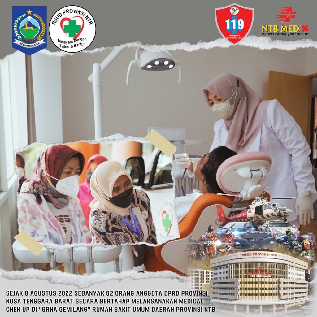RSUD Provinsi NTB untuk kesekian kalinya di percaya oleh DPRD Provinsi NTB sebagai tempat medical check up bagi seluruh anggota Dewan Provinsi NTB, sebanyak 62 orang anggota DPRD Provinsi NTB dijadwalkan Mengikuti Medical Chek up yang dilaksanakan di Poli Ekskutif “Grha Gemilang” RSUD Provinsi NTB, pelaksanaan MCU di mulai dari tanggal 8 agustus 2022 dan berakhir pada bulan November yang di lakukan secara berkala.