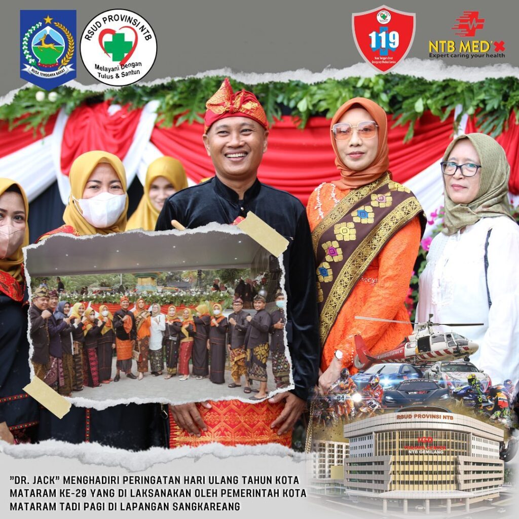 dr. Jack menghadiri Upacara Peringatan Hari Ulang Tahun Ke – 29 Kota Mataram dengan Tema “Pulih dan Bangkit Bersama HARUM” di Lapangan Sangkareang Kota Mataram, dengan balutan Busana Tradisional Sasak dr. Jack hadir dan berada di posisi deretan Tamu VIP lainnya.