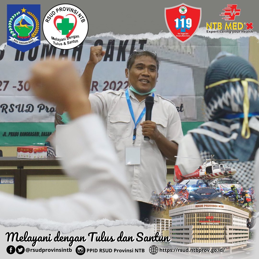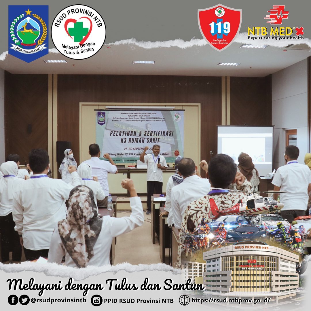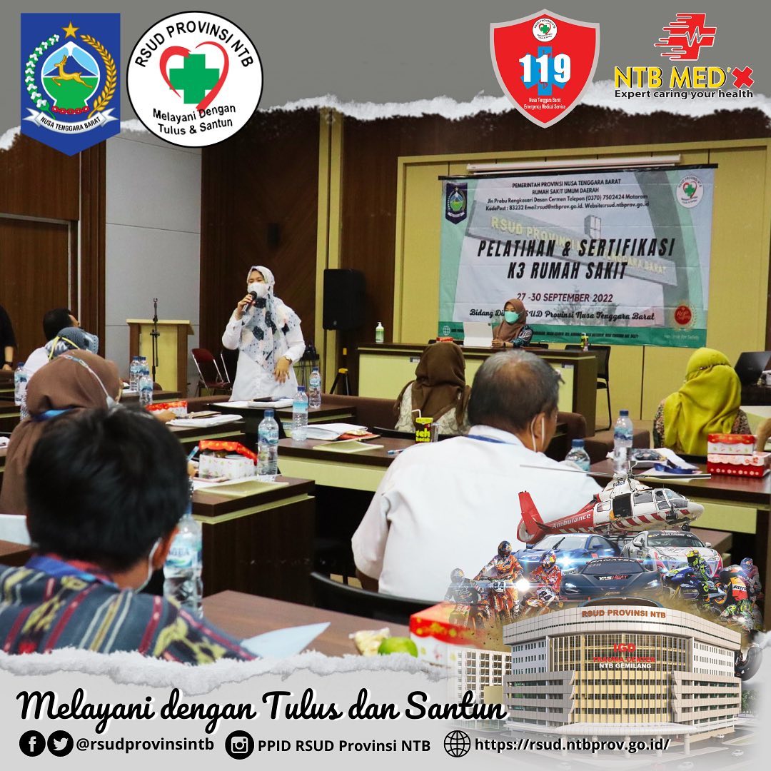 Pagi ini RSUD Provinsi NTB berkerjasama dengan PT. Wina Karya Mulia Rojo Safety (Management and Safety Consulting) menggelar Pelatihan dan Sertifikasi K3RS “Keselamatan dan kesehatan kerja Rumah Sakit” Acara ini dibuka langsung oleh dr. Hj Suciati selaku Wakil direktur SDM dan Diklat, Pelaksanaan Pelatihan dan sertifikasi K3RS ini tanggal 27 s/d 30 September 2022 bertempat di Aula Prof. dr. Soewignyo lt 4 RSUD Provinsi NTB, Total yang Mengikuti Pelatihan dan sertifikasi K3RS berjumlah 19 Peserta, Peserta yang mengikuti pelatihan dan sertifikasi K3RS ini tidak Hanya Wilayah NTB saja, ada juga beberapa dari luar daerah