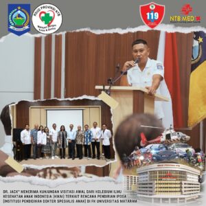 Beberapa saat lalu dr. Jack menerima kunjungan Visitasi awal dari Kolegium Ilmu Kesehatan Anak Indonesia (KIKAI) terkait rencana pendirian IPDSA (Institusi Pendidikan Dokter Spesialis Anak) di Fakultas Kedokteran Universitas Mataram dan Rumah Sakit Umum Daerah Provinsi Nusa Tenggara Barat sebagai Rumah Sakit Pendidikan. Dipimpin langsung oleh Ketua Kolegium Ibu Dr. Fatima Safira Alatas, Ph. D, Sp.A(K) dan dua orang Anggota di terima langsung di Aula Prof. Soewignyo RSUD Provinsi NTB.