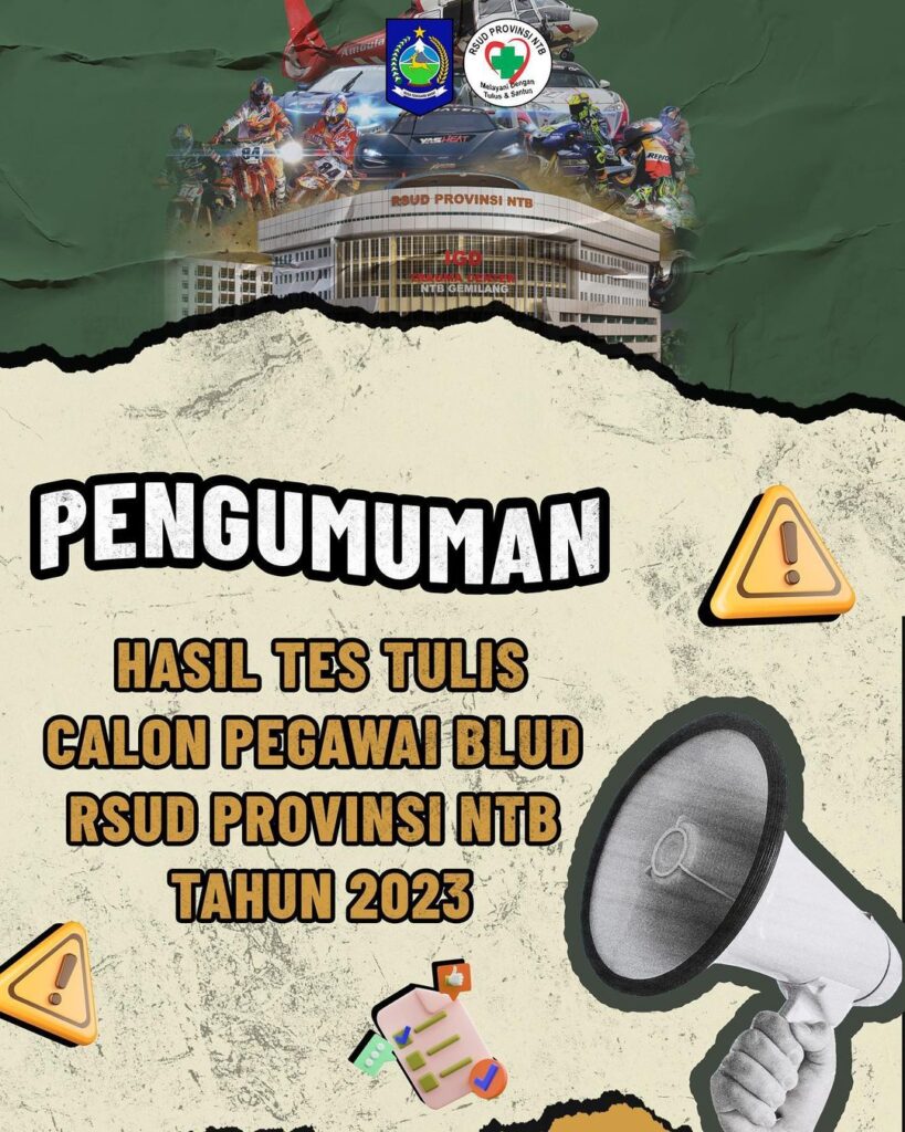 Berdasarkan hasil tes tulis seleksi penerimaan pegawai BLUD RSUD Provinsi NTB tahun 2023 yang dilaksanakan pada tanggal 6 s.d. 7 Januari 2023, dengan ini disampaikan daftar nama-nama peserta yang dinyatakan lulus sebagaimana tercantum dalam link berikut ini : https://tinyurl.com/FinalTesTulisRSUP2023