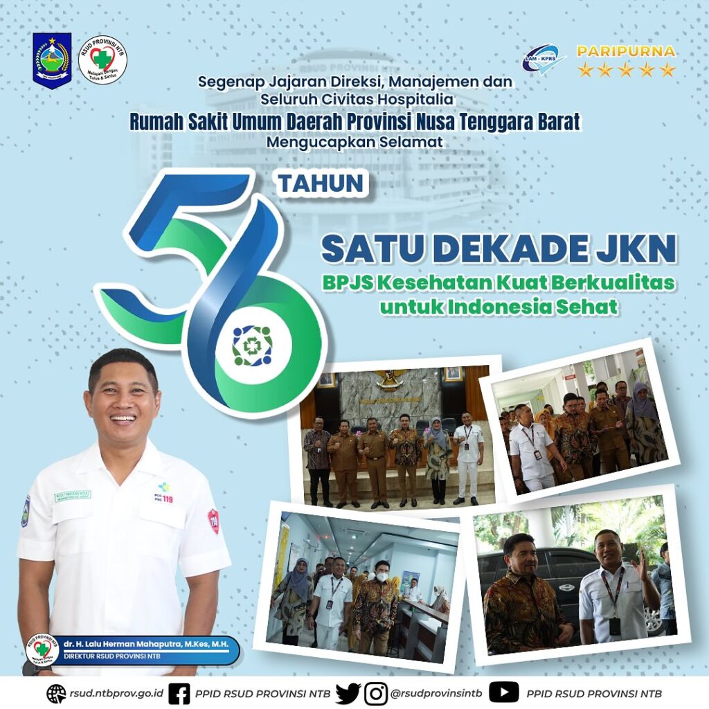 Segenap Jajaran Direksi, Manajemen dan Seluruh Civitas Hospitalia Rumah Sakit Umum Daerah Provinsi Nusa Tenggara Barat mengucapkan Dirgahayu ke 56 Tahun Badan Penyelenggara Jaminan Sosial (BPJS) Kesehatan Republik Indonesia “Satu Dekade JKN, BPJS Kesehatan Kuat Berkualitas untuk Indonesia Sehat”
