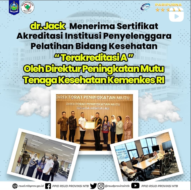 Setelah beberapa saat lalu dilakukan akreditasi Kemarin dr. Jack didampingi oleh Wakil Direktur SDM & Diklit, KTK Hukum & Humas dan Kepala Instalasi Diklat Rumah Sakit Umum Daerah Provinsi Nusa Tenggara Barat menerima Sertifikat Akreditasi Institusi penyelenggara pelatihan bidang Kesehatan “Terakreditasi A” yang diserahkan langsung oleh Direktur Peningkatan Mutu Tenaga Kesehatan Kemenkes RI Bapak Lupi Trilaksono, S.F, MM, Apt.