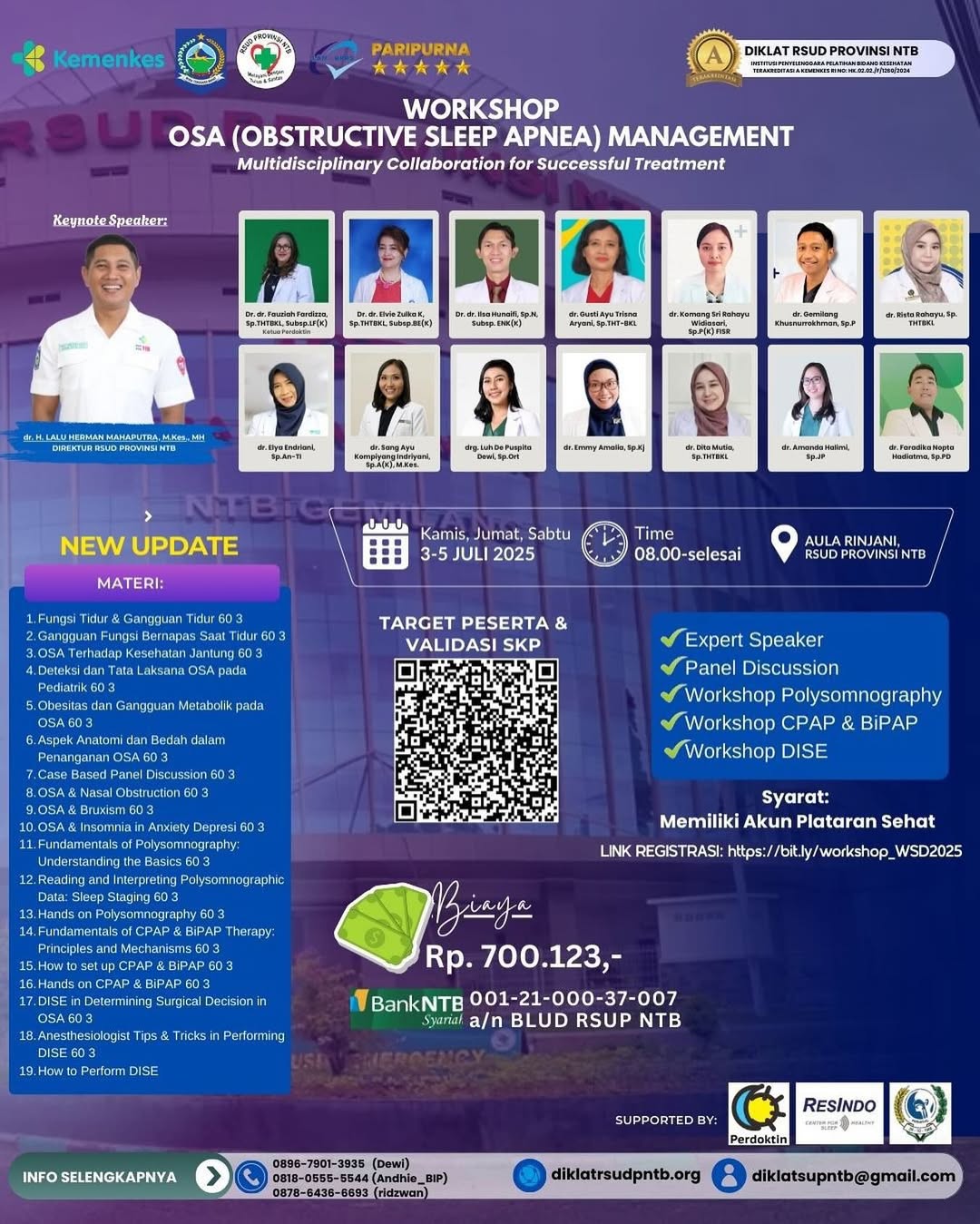 Kami mengundang para dokter untuk berpartisipasi dalam acara *_Workshop “Obstructive Sleep Apnea Management: Multidisciplinary Collaboration for Successful Treatment!”_* yang diselenggarakan oleh RSUD Provinsi NTB berkolaborasi dengan PERDOKTIN pada: