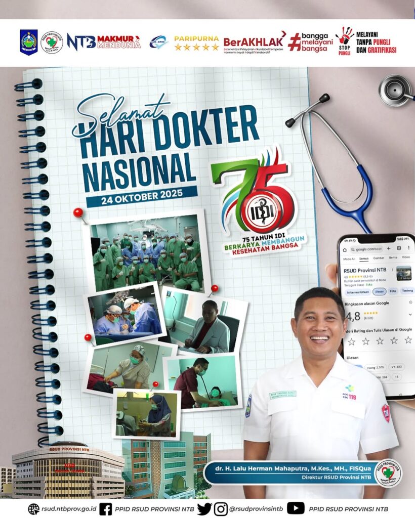 Segenap Jajaran Direksi, Manajemen dan seluruh Civitas Hospitalia Rumah Sakit Umum Daerah Provinsi Nusa Tenggara Barat mengucapkan Selamat Hari Dokter Nasional dan 75 Tahun Ikatan Dokter Indonesia, semangat & Gaspol untuk terus Berkarya Membangun Kesehatan Bangsa