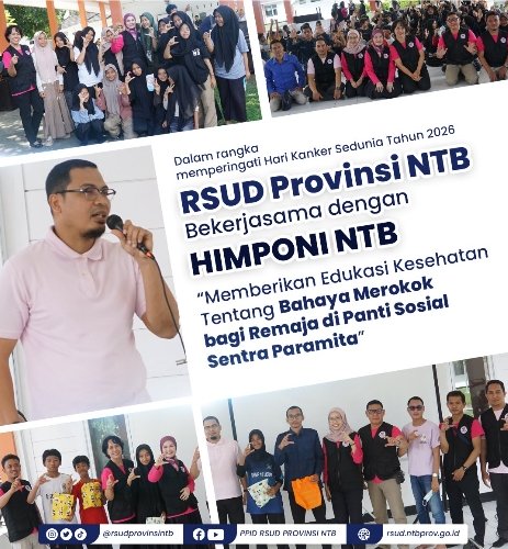 Dalam rangka memperingati Hari Kanker Sedunia Tahun 2026, RSUD Provinsi NTB bekerja sama dengan HIMPONI NTB mengadakan acara pengabdian masyarakat di Panti Sosial Sentra Paramita. Acara ini diisi oleh Narasumber dr. Moulid Hidayat, Phd, Sp.P (k) Onk yang memberikan penyuluhan tentang bahaya rokok bagi remaja