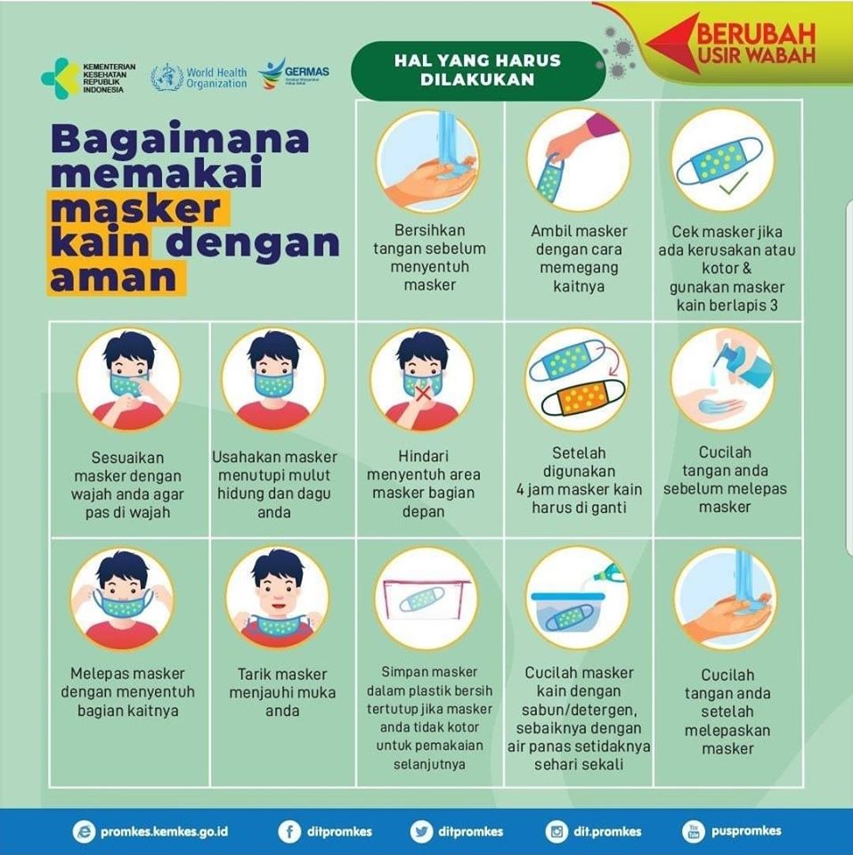 WHO telah mewajibkan penggunaan masker setiap keluar rumah atau saat berada di keramaian. Penggunaan masker kain disarankan mengingat kelangkaan masker bedah saat ini. Riset efektifitas menunjukkan bahwa penggunaan masker kain dapat mengurangi resiko penyebaran virus hingga 70%.