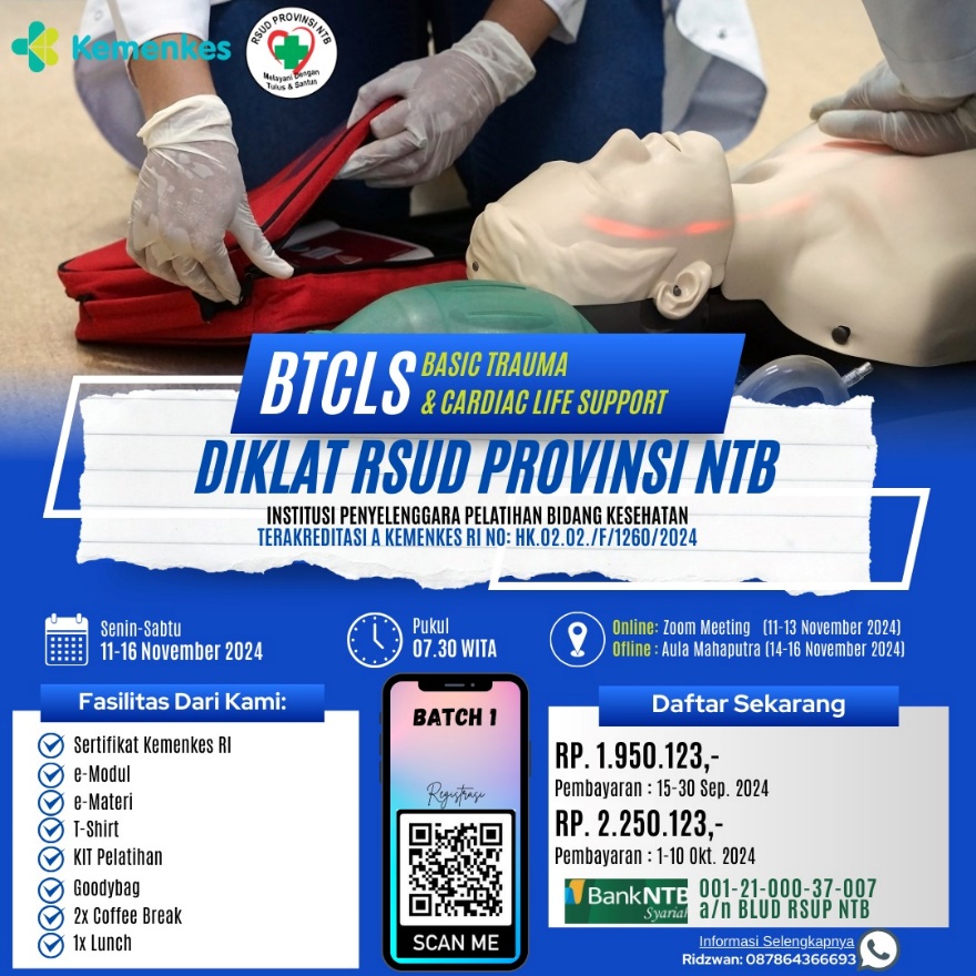 Hello Healthy People dan Civitas Hospitalia Sebagai Penyelenggara Pelatihan Bidang Kesehatan terakreditasi A oleh Kemenkes RI, RSUD Provinsi NTB menggelar Pelatihan Basic Trauma & Cardiac Life Support (BTCLS) pada tangal 11-16 November 2024 di Ruang Belajar A Gedung Onkologi RSUDP Baca Selengkapnya